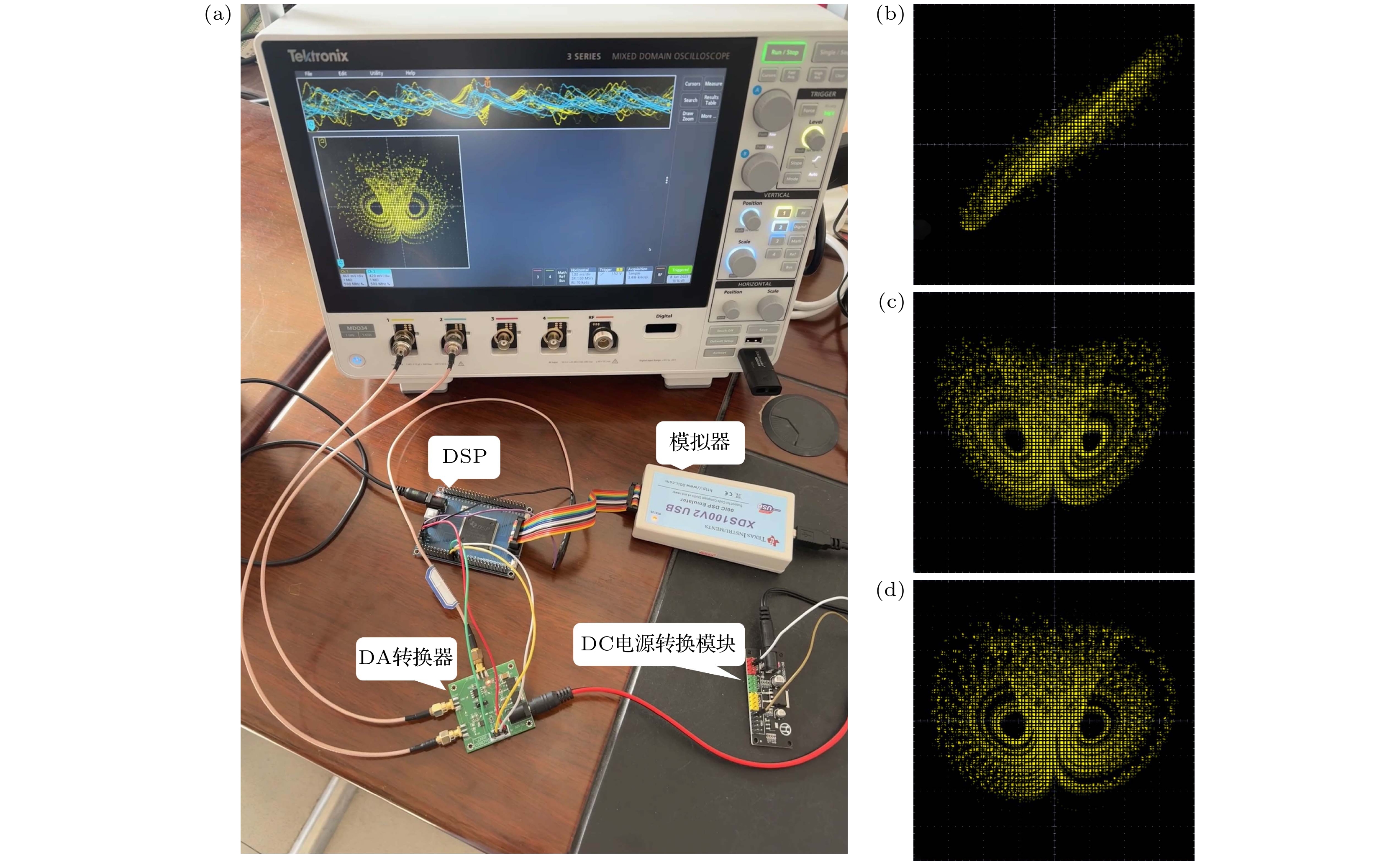图 26 系统(3)在$ (a, b, c, d, e, k)=(51, 3, 30, 2, 0.1, 0.1) $, $ (x_0, y_0, z_0, w_0)=(10, 10, 10, 10) $条件下的DSP实现 (a) DSP实验平台; (b) 在x-y平面; (c) 在x-z平面; (d) 在y-z平面