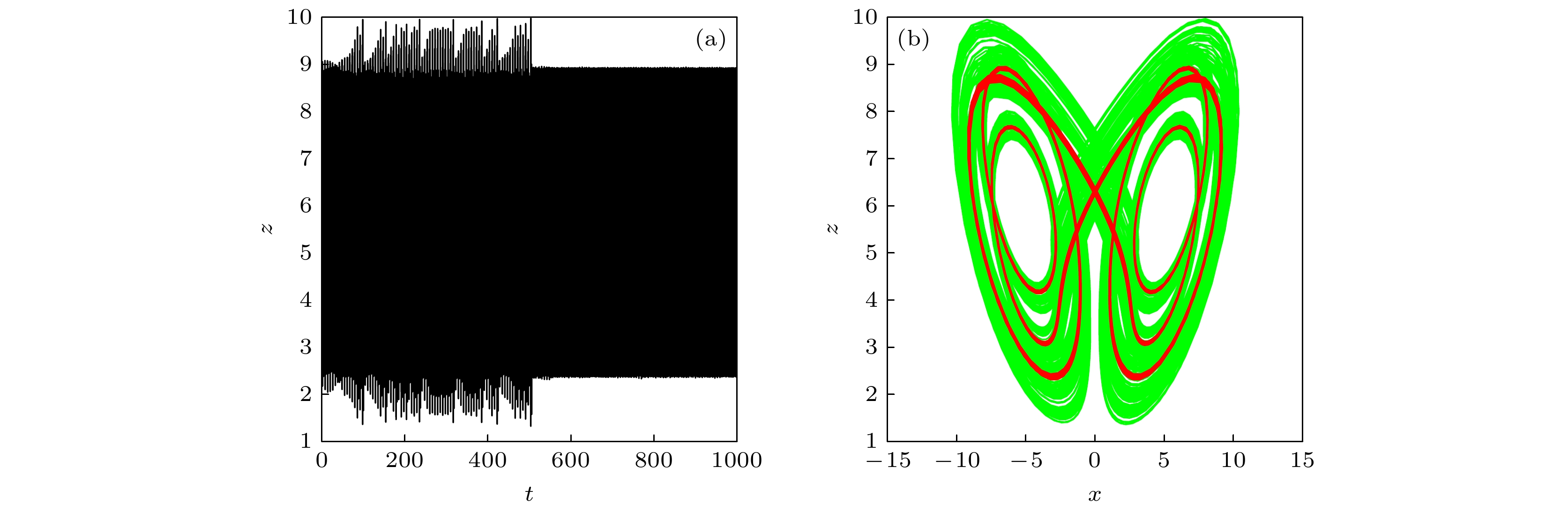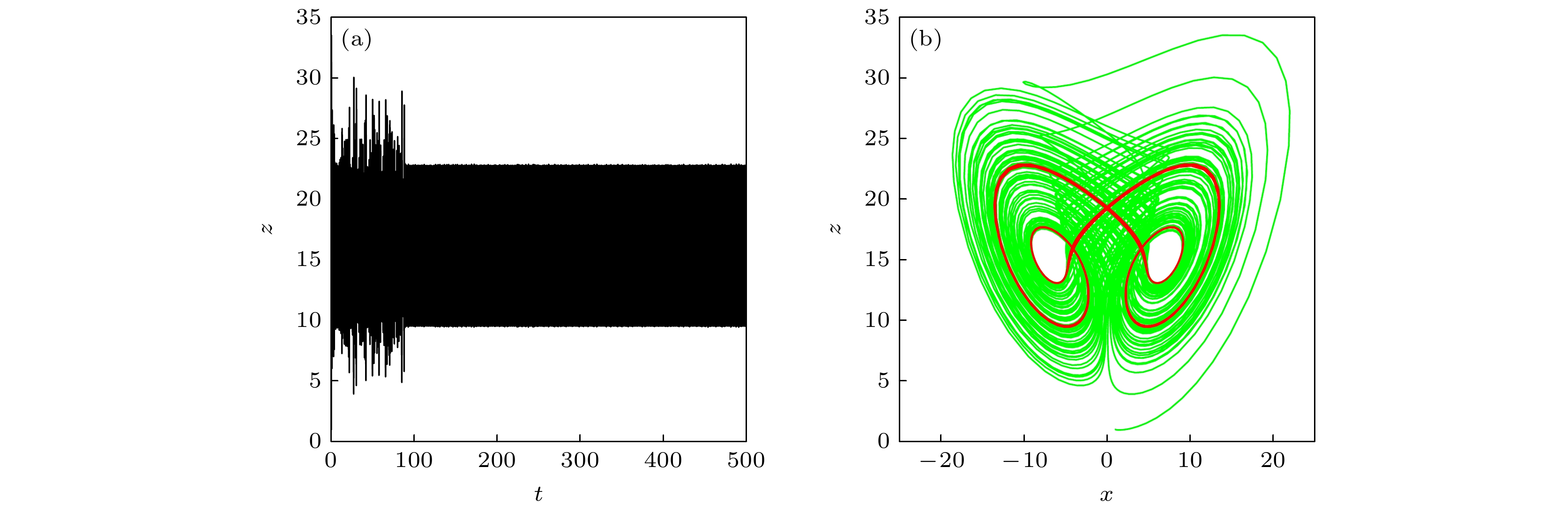 图 7 暂态混沌转换周期行为 (a) z 的时域波形; (b) 在$ t\in \left (0, 100 \right) $ (绿色) 和$ t\in\left(200, 500\right) $ (红色) 下的相图