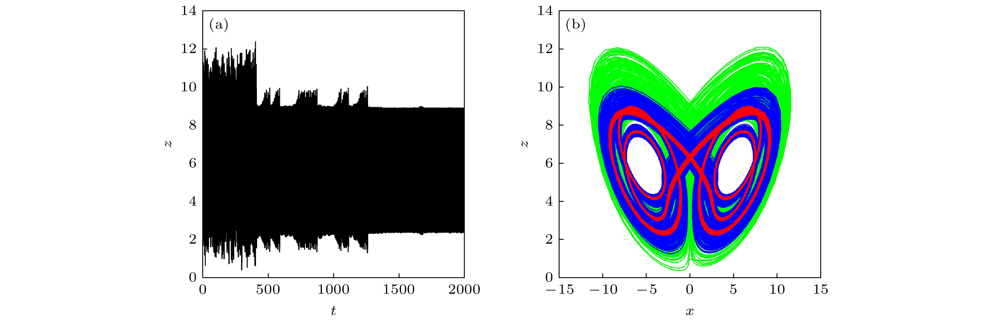 图 9 暂态超混沌转换周期行为 (a) z 的时域波形; (b) 在$ t\in \left (0, 400 \right) $ (绿色), $ t\in \left (400, 1260 \right) $ (蓝色) 和$ t\in \left (1260, 2000 \right) $ (红色) 下的相图