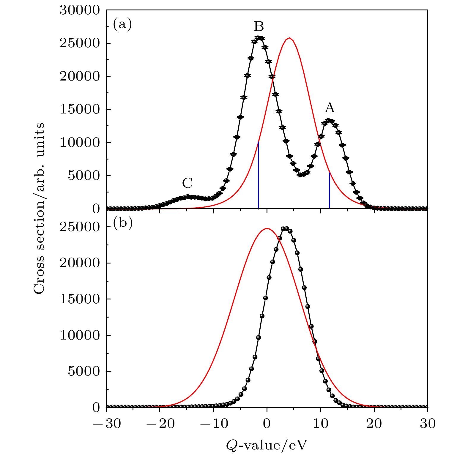 图 2 40 keV能量下Ar2+-Ar碰撞过程的(a)单、(b)双电子俘获的散射角分布. 红色实线表示MCBM计算的散射角分布. 黑色竖线为辅助线, 竖线右侧为未完全收集的部分
