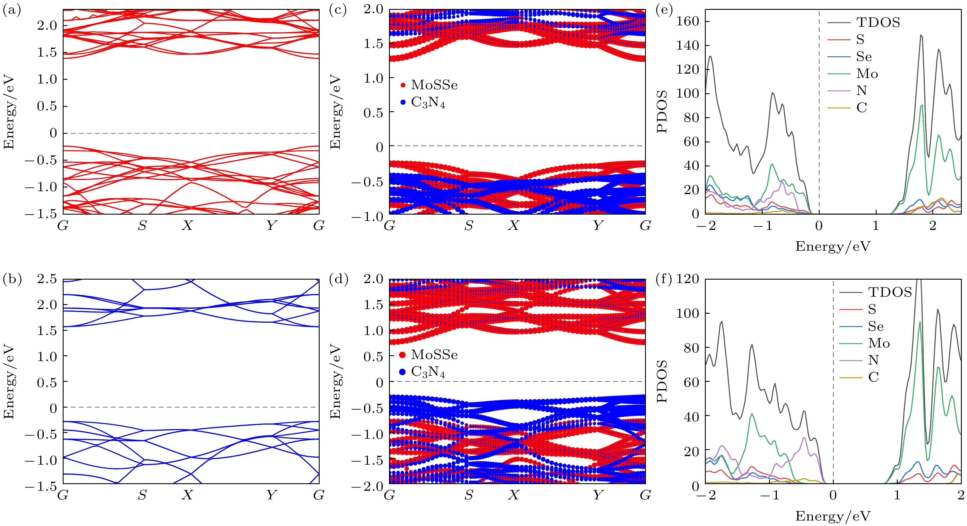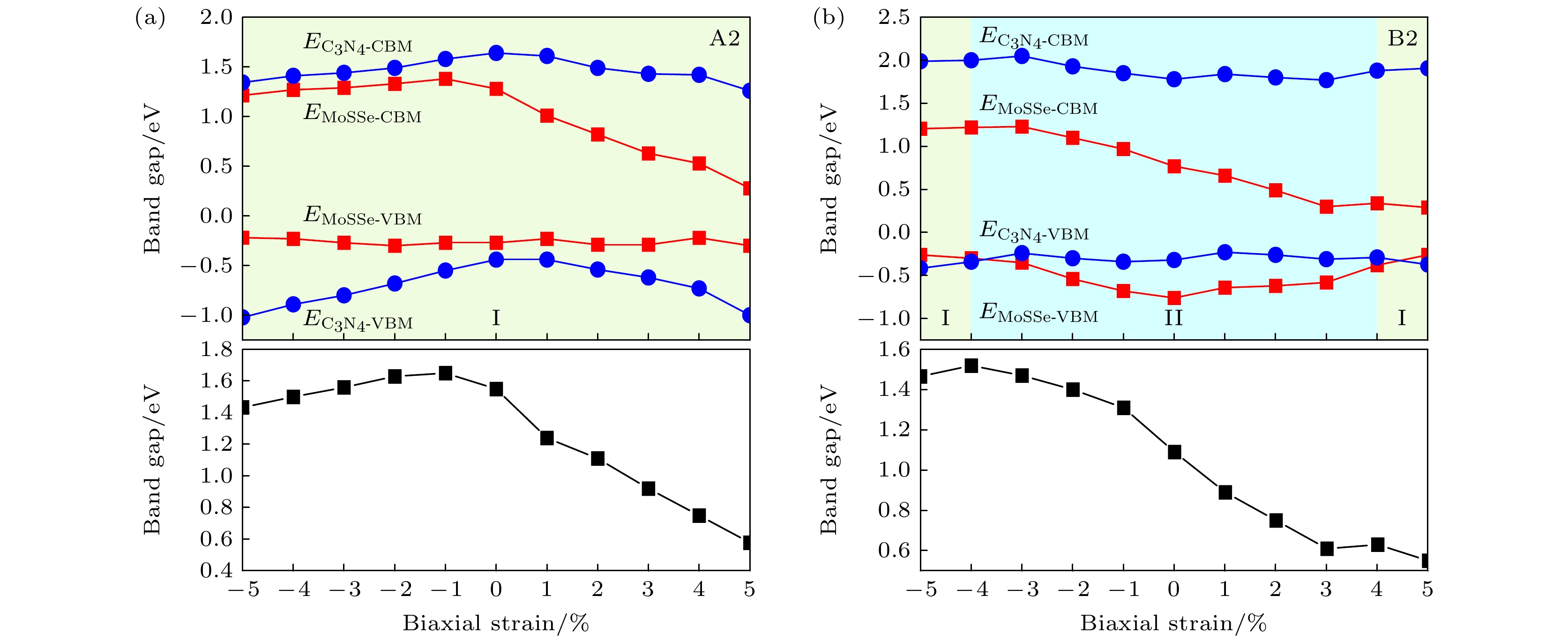 构建范德瓦耳斯异质结是丰富二维材料物性并增强其光电等性能的有效策略. 本文基于第一性原理模拟, 系统地研究了两种不同界面结构的Janus MoSSe/g-C3N4异质结(即SMoSe/g-C3N4和SeMoS/g-C3N4)的电子性质及其双轴应变调控规律. 结果表明, 针对SMoSe/g-C3N4异质结构, MoSSe本征偶极场与界面电场方向一致, 相互叠加形成由g-C3N4指向MoSSe的增强电场, 体系呈现I型能带排列特征; 而在SeMoS/g-C3N4异质结构中, 两者方向相反, 部分相互抵消后形成由MoSSe指向g-C3N4的净电场, 呈现II型能带排列特征, 可促进载流子的分离从而有效提升其光催化分解水活性. 进一步研究发现, 施加双轴应变可有效地调节两种异质结构的电子能带, 尤其在SeMoS/g-C3N4中可实现I型与II型能带结构的可逆转变. 本研究为Janus MoSSe/g-C3N4异质结在光催化与光电器件领域的应用提供了理论依据.Constructing van der Waals (vdW) heterostructures has emerged as an effective strategy for enriching the physical properties of two-dimensional materials and optimizing their optoelectronic performance. In this work, we systematically investigate the electronic properties and biaxial strain modulation of Janus MoSSe/g-C3N4 heterostructures with two distinct interfacial configurations—SMoSe/g-C3N4 and SeMoS/g-C3N4—by means of first-principles simulations. Binding energy comparisons and AIMD simulations are performed to determine the most stable stacking pattern of each type of the heterostructure. The analyses of the electrostatic potential and work function reveal that the intrinsic dipole of MoSSe layer and the interfacial electric field in the SMoSe/g-C3N4 heterostructure undergo a constructive superposition. This enhances the overall built-in electric field, which points from g-C3N4 layer to MoSSe layer, resulting in a type-I band alignment. In contrast, in the SeMoS/g-C3N4 configuration, the two fields oppose each other, leading to a net electric field directed from MoSSe to g-C3N4 layer. This leads to a type-II band alignment, which facilitates spatial carrier separation and significantly enhances photocatalytic water-splitting activity. Furthermore, this study also demonstrates that biaxial strain can effectively modulate the electronic band structures of both types of heterostructures. In particular, the SeMoS/g-C3N4 system exhibits a reversible transition between type-I and type-II band alignments under specific compressive (–4%) and tensile (+5%) strain states. The underlying mechanism is elucidated by the difference charge density calculations. This study provides theoretical insights into the role of interfacial and intrinsic dipoles combined with strain engineering, offering a viable route for designing efficient MoSSe/g-C3N4-based photocatalysts and optoelectronic devices.
