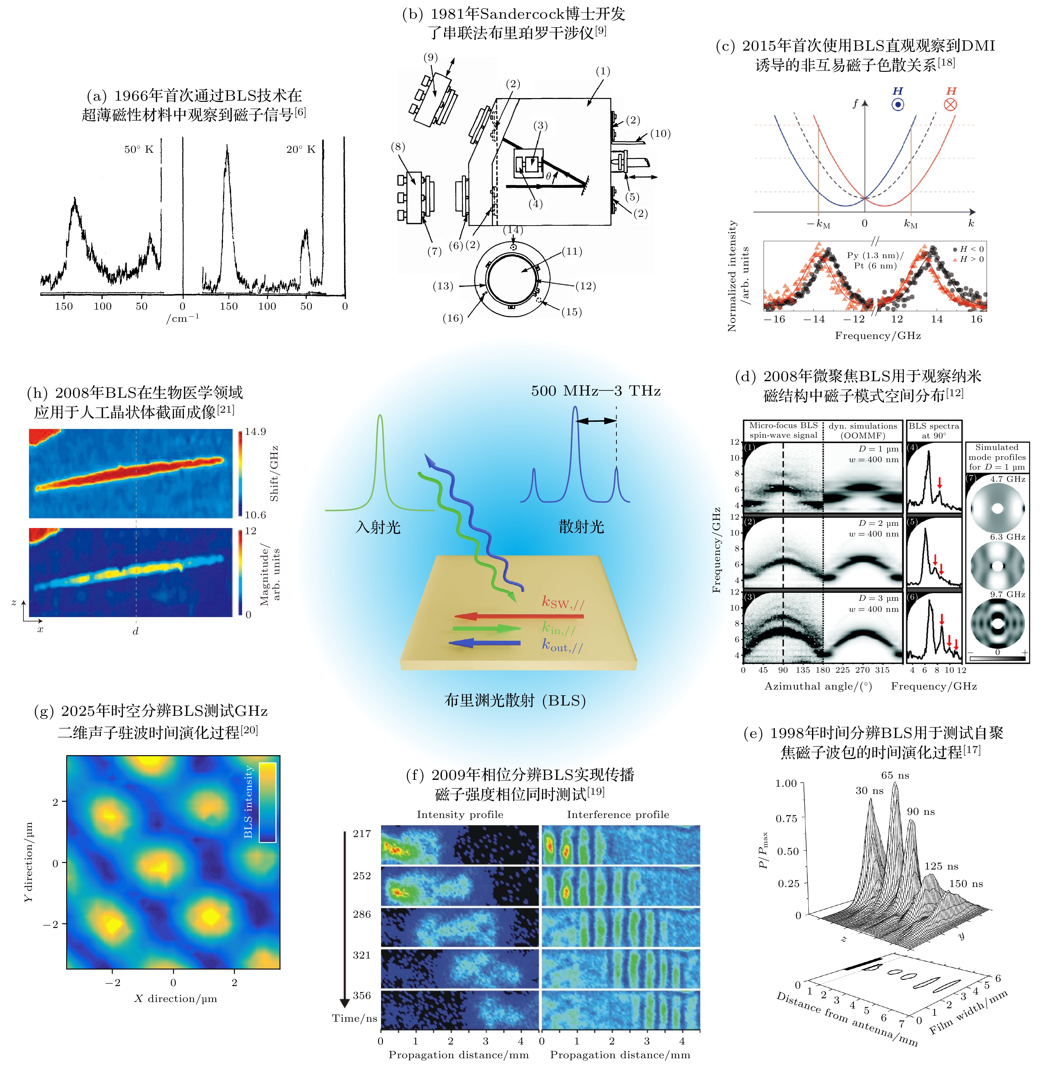 Fig. 1. Historical milestones and landmark achievements in Brillouin light scattering technology. (a) First magnetic application of BLS technology in 1966: observation of spin wave signals in FeF2 thin films, with characteristic peaks at 52 cm–1 and 154 cm–1 first revealing the magnon excitation spectrum[6]; (b) Tandem Fabry-Pérot interferometer (TFPI) developed by Sandercock in 1981, whose breakthrough high contrast and wide dynamic range characteristics remain the core component of BLS systems to this day[9]; (c) Direct observation of interfacial DMI effects in 2015: asymmetric frequency shifts of Stokes/anti-Stokes peaks in Ni80Fe20/Pt bilayer films, providing a key experimental tool for chiral magnetic structure research[18]; (d) Micro-focused BLS breakthrough in 2008: spatial imaging of spin wave modes in submicron-scale (400 nm width) magnetic rings, revealing size-dependent eigenmode distribution patterns[12]; (e) Ultrafast magnon dynamics research in 1998: time-resolved BLS first captured the spatiotemporal self-focusing dynamics of spin wave packets in magnetic thin films, showing two-dimensional spin wave intensity distributions and their full-width-half-maximum contours at different propagation times[17]; (f) Phase-resolved technology breakthrough in 2009: phase-sensitive measurements achieved through magneto-optical modulation, enabling direct detection of propagating spin wave phases, with interference patterns clearly revealing the phase structure of wave packets[19]; (g) Surface acoustic wave evolution imaging: BLS demonstrates the formation process of two-dimensional standing waves in time and space[20]; (h) Biomedical applications in 2008: high-resolution cross-sectional imaging of elastic modulus in artificial lens achieved, with the upper image showing elastic modulus distribution based on frequency shift measurements and the lower image using scattering intensity as contrast[21].