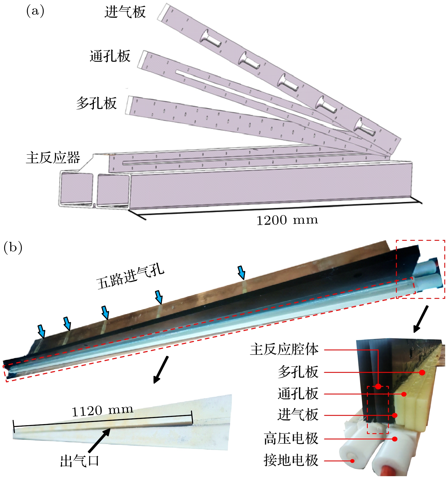 本文报道了一种新型米量级宽幅间接介质阻挡放电(DBD), 用于满足大尺度、形状复杂材料的处理需求. 通过模块化分级气路设计与仿真优化, 提高放电区域及被处理材料表面流场分布均匀性. 在此基础上, 以Ar作为工作气体, 以六甲基二硅烷(HMDSO)为反应媒质, 在纳秒脉冲电源激励下产生米量级宽幅等离子体. 通过电学、光谱、温度诊断方法来评估不同运行条件参数下的粒子活性、放电均匀性和稳定性, 并对环氧材料改性, 通过水接触角测量验证改性效果及其均匀性. 结果表明, 在合适的运行条件参数下, 可产生尺寸为1120 mm的宽幅均匀稳定等离子体. 增大电压幅值使放电强度和粒子活性提升, 但放电均匀性和稳定性会显著降低; 增大工作气体流速虽可同时提升粒子活性、放电均匀性和稳定性, 但提升幅度较小. 在电压幅值为12 kV、工作气体流速为10 L/min条件下处理10 min后, 环氧(EP)材料表面的水接触角从67°均匀提升至144°, 波动幅度低于6%. 本文所报道的米量级宽幅间接DBD电极可为大尺度等离子体材料改性技术工业应用提供参考和依据.A meter-scale wide indirect dielectric barrier discharge (DBD) for treating large-scale and irregular-shaped materials is reported in this study. The structure of the modular-graded gas path is designed, and the influence of gas hole density on the flow field is simulated. It is confirmed that 8 subdividing (40 holes uniformly distributed) structure can effectively improve the uniformity of the gas flow rate distribution in the discharge area and on the treated material surface compared with 0 subdividing structure. Based on this structure, Ar is employed as the discharge gas and hexamethyldisilane as the precursor to generate meter-scale wide plasma under the excitation of a nanosecond pulsed power supply. Particle activity, discharge uniformity and stability under different operating parameters are evaluated by measuring voltage-current waveforms, emission spectra, luminescence images and temperatures at different electrode positions. The treatment effect and uniformity are verified by measuring the water contact angle (WCA) of epoxy (EP) material. The results show that a uniform and stable plasma with a width of 1120 mm is generated under suitable operating parameters. By increasing the voltage amplitude, both the discharge intensity and particle activity are improved, while the discharge uniformity and stability are significantly reduced. By increasing the discharge gas flow rate, the particle activity, discharge uniformity, and stability can be improved simultaneously but slightly. The WCA on the EP surface is uniformly increased from 67° to 144° with a variation of less than 6% after 10-min treatment at a voltage amplitude of 12 kV and a discharge gas flow rate of 10 L/min. The meter-scale wide indirect DBD electrode in this work can provide reference and basis for the industrial application of large-scale plasma material modification technology.