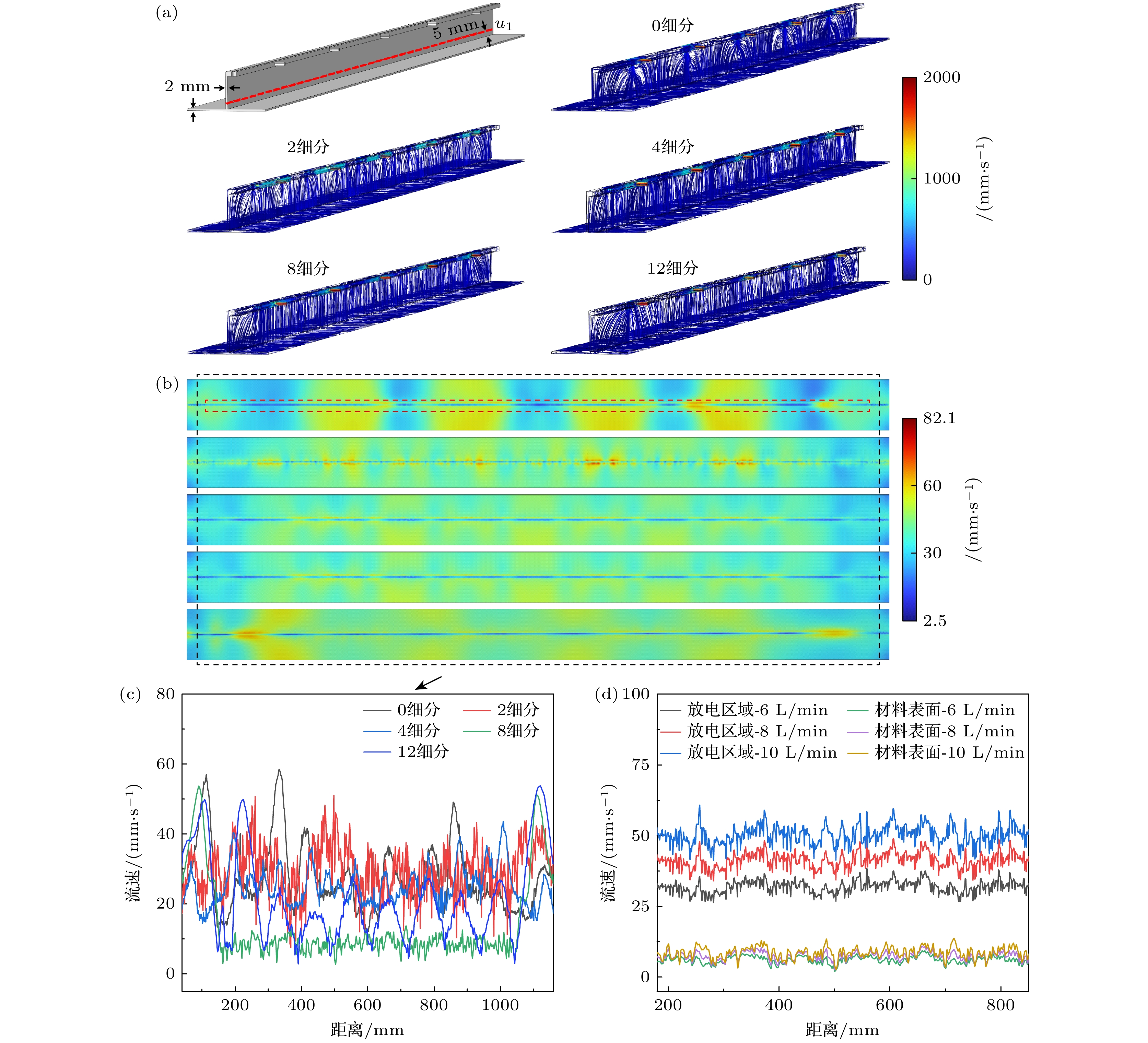 图 2 米量级宽幅间接DBD电极流场仿真 (a) 不同结构下工作气体流速的流线; (b), (c) 不同结构下处理材料表面流速分布; (d) 不同工作气体流速下的放电区域和材料表面流速分布