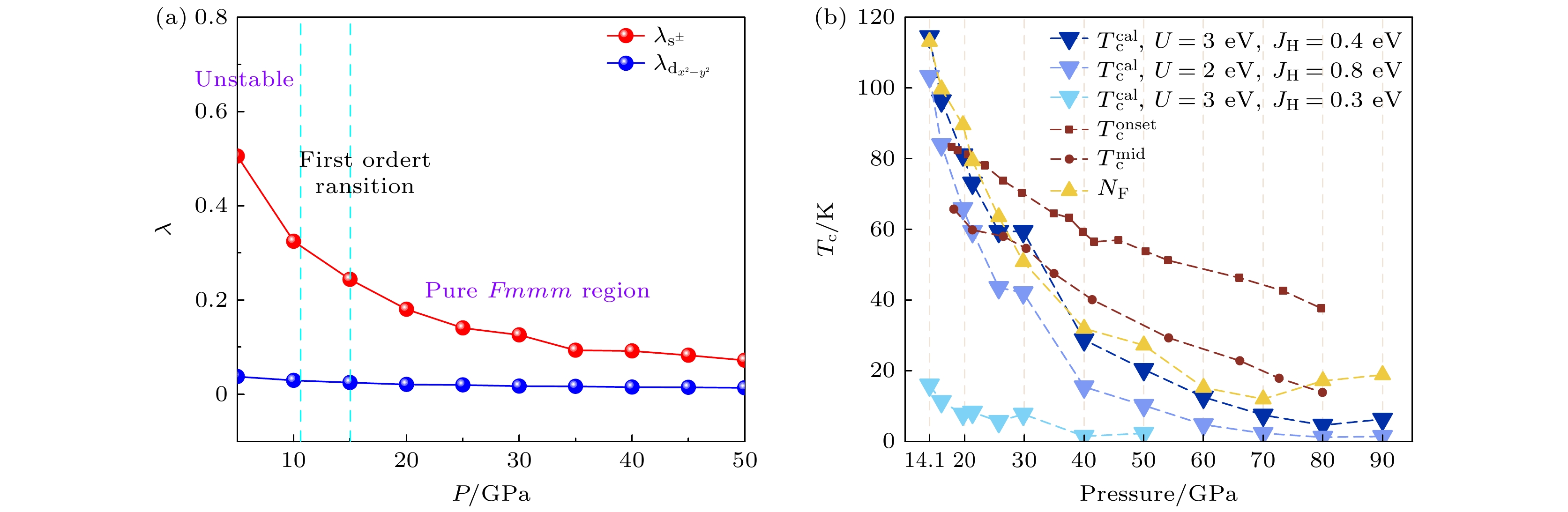 (块材, 高压)RPA [68] 双层两轨道($ d_{x^2-y^2}, d_{z^2} $) 最强自旋涨落波矢$ Q\approx(\pi, 0) $. $ s^{\pm} $波配对, 能隙在$ \gamma/\alpha $口袋与β口袋上符号相反. 超导由层间$ d_{z^2} $轨道配对主导. FRG [69] 双层两轨道($ d_{x^2-y^2}, d_{z^2} $) 与RPA [63]定性一致 FLEX [70] 双层两轨道($ d_{x^2-y^2}, d_{z^2} $) 与RPA/FRG结论一致. 发现解除$ d_{x^2-y^2} $与$ d_{z^2} $轨道间的杂化能显著增强$ T_c $. La4Ni3O10