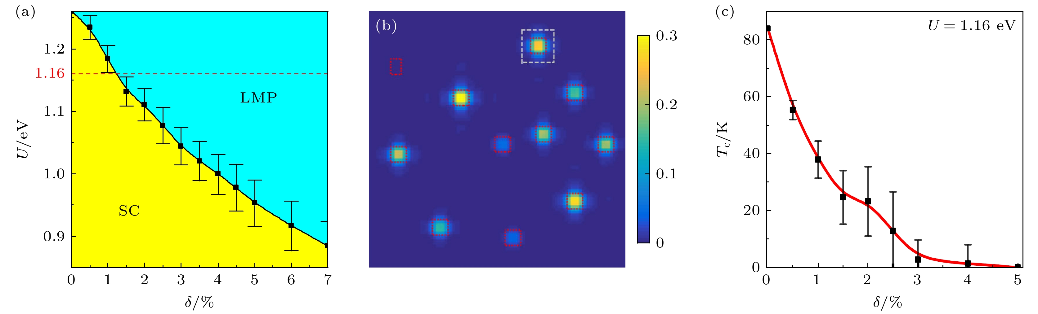 图 12 高压La3Ni2O7中顶角氧缺陷对超导的影响的RPA研究[68] (a) 相互作用强度U-顶角氧缺陷浓度δ相图. SC和LMP分别表示超导和局域磁序, 黑色实线表示临界相互作用$ U_c $ (b) 磁矩在实空间的分布, 颜色表示磁矩大小. 红色虚线框内为顶角氧缺陷位置 (c) 超导$ T_c $与顶角氧缺陷浓度δ的关系