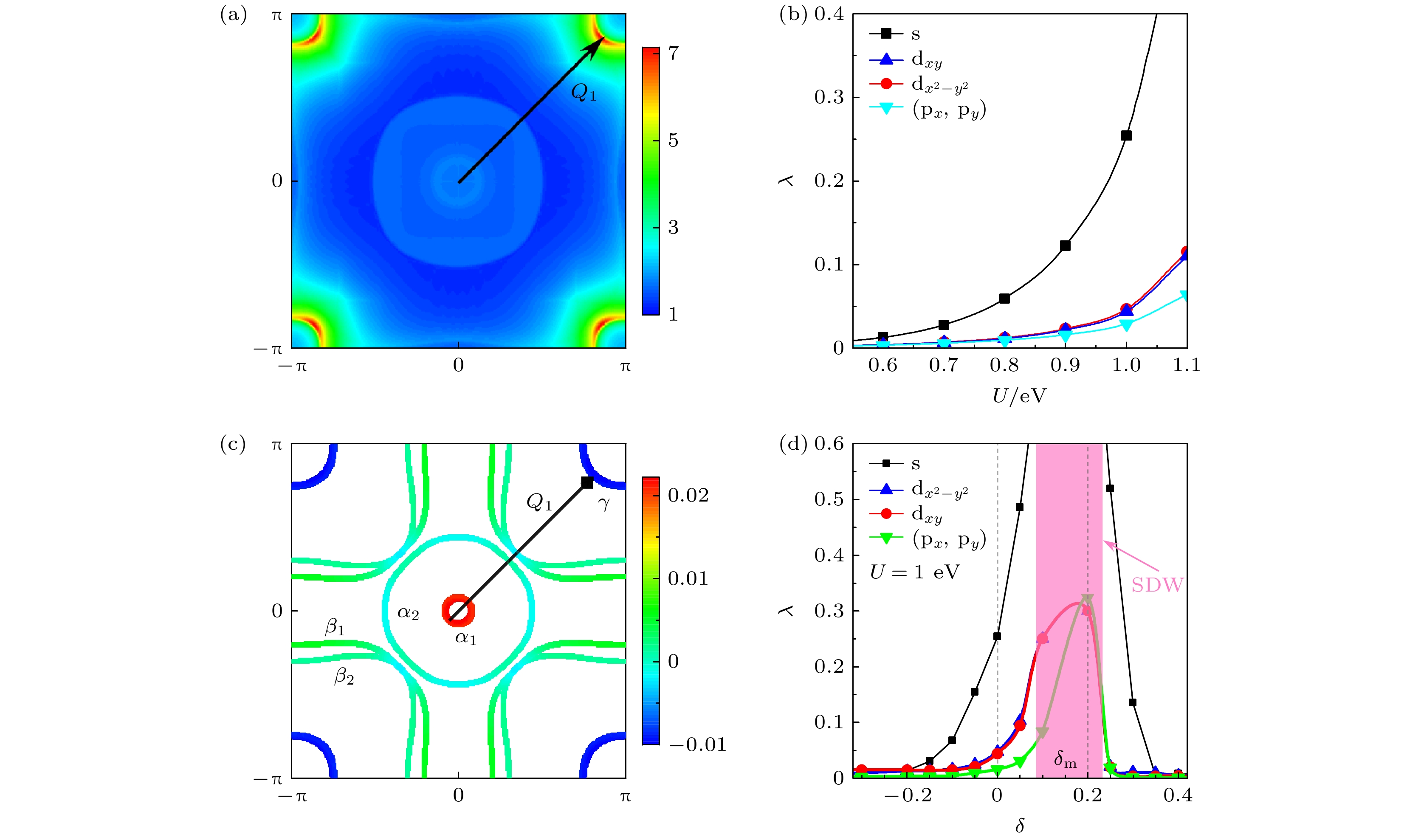 图 13 RPA计算得到的La4Ni3O10的自旋极化率以及超导[57] (a) RPA重整化自旋极化率在第一布里渊区的分布, 其最大值位于$ {\bf{Q}}_1 $ (b) 各配对对称性的配对本征值λ的最大值对U的依赖 (c) 体系中主导的配对能隙$ s^{\pm} $波在费米面的分布, 其中$ {\bf{Q}}_1 $矢量联系了$ \alpha_1 $口袋和γ口袋之间的费米面嵌套 (d) 各配对对称性的配对本征值λ的最大值对掺杂浓度δ的依赖