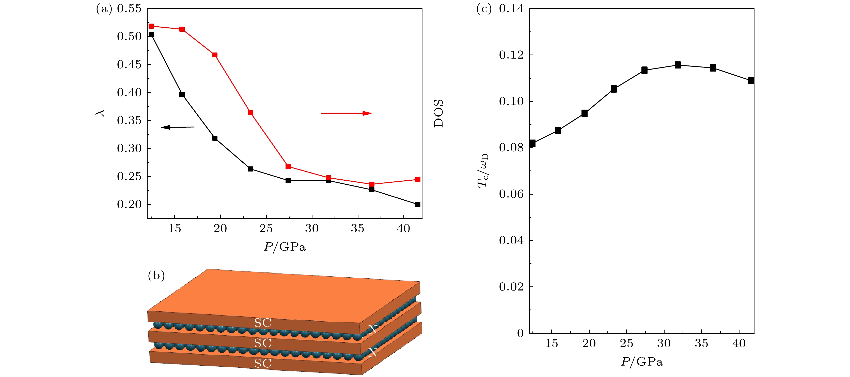 图 15 La5Ni3O11中超导对压力的依赖[58] (a) 体系态密度(DOS, 红线)和RPA计算得到的超导配对本征值λ(黑线)对压力的依赖 (b) La5Ni3O11中超导态-正常态-超导态的约瑟夫森结构示意图 (c) La5Ni3O11中超导$ T_c $的压力依赖