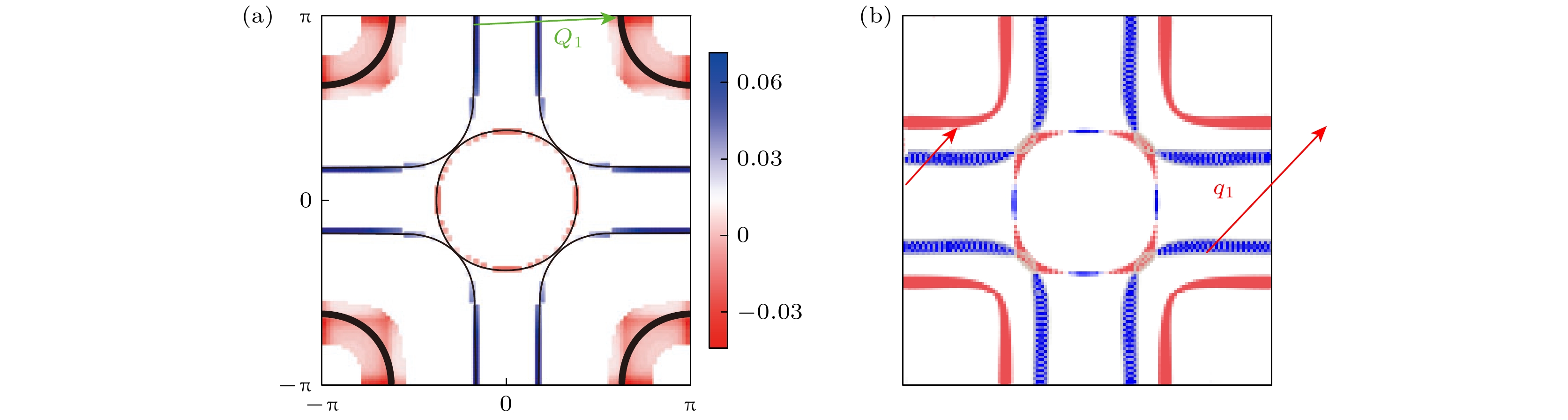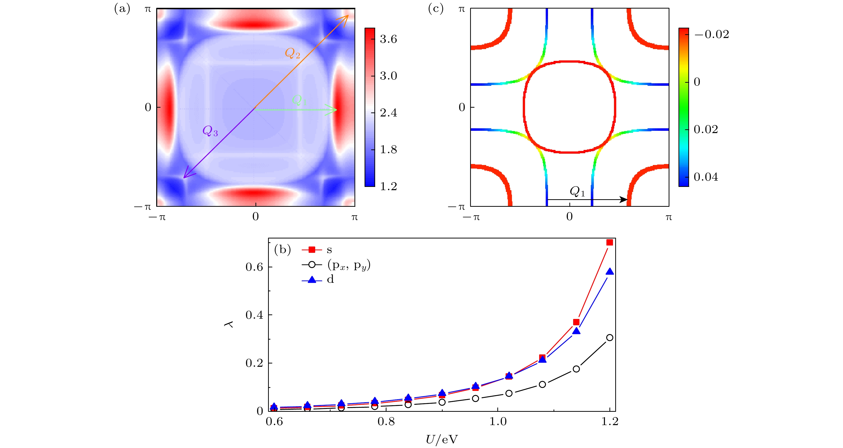 图 9 高压下La3Ni2O7的RPA计算结果[68] (a) $ \chi^{(s)} $的最大本征值在布里渊区的分布, 最强自旋涨落的波矢记为$ Q_{1} $, 其余较强的自旋涨落波矢记为$ Q_{2} $、$ Q_{3} $ (b) 不同配对对称性的配对本征值λ随U变化的函数关系 (c) $ s^{\pm} $配对的能隙函数在费米面上的分布, $ Q_1 $为费米口袋的嵌套矢量, 与图(a)中的自旋涨落矢量相等