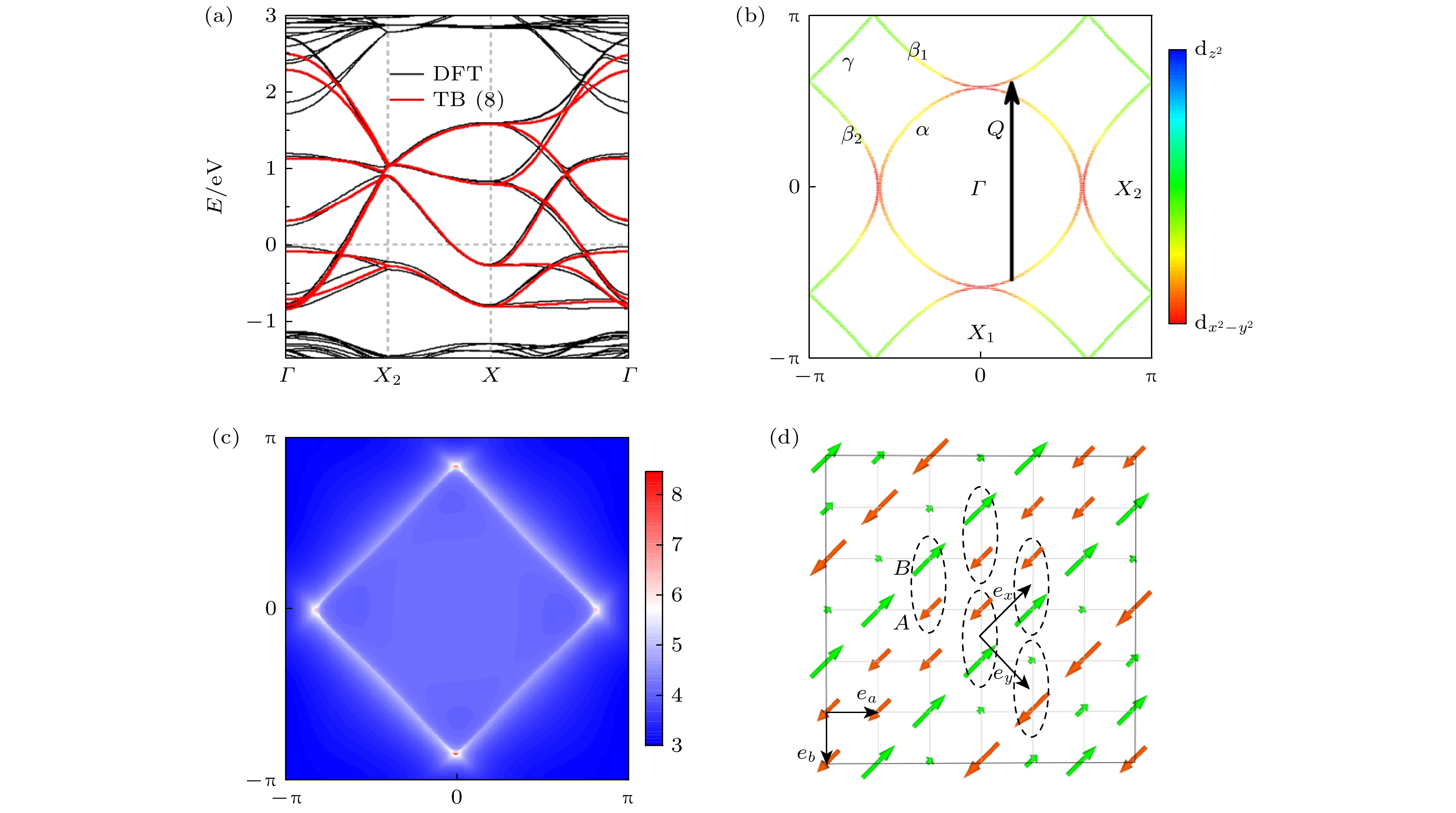 图 18 常压下La3Ni2O7的RPA计算结果[71] (a) 常压下La3Ni2O7在折叠布里渊区中的能带结构. TB能带(红线)与DFT能带(黑线)在低能附近基本一致 (b) 与图(a)能带对应的费米口袋. Q为费米口袋嵌套矢量 (c) 自旋极化率$ \chi^{(s)} $的最大本征值在布里渊区的分布, 其最大值位置对应图(b)中的费米口袋嵌套矢量Q (d) 磁矩在实空间的面内分布. 元胞(虚线椭圆)包含A, B子格, $ e_{x/y} $与$ e_{a/b} $为两套格矢, 分布对应折叠和扩展的布里渊区