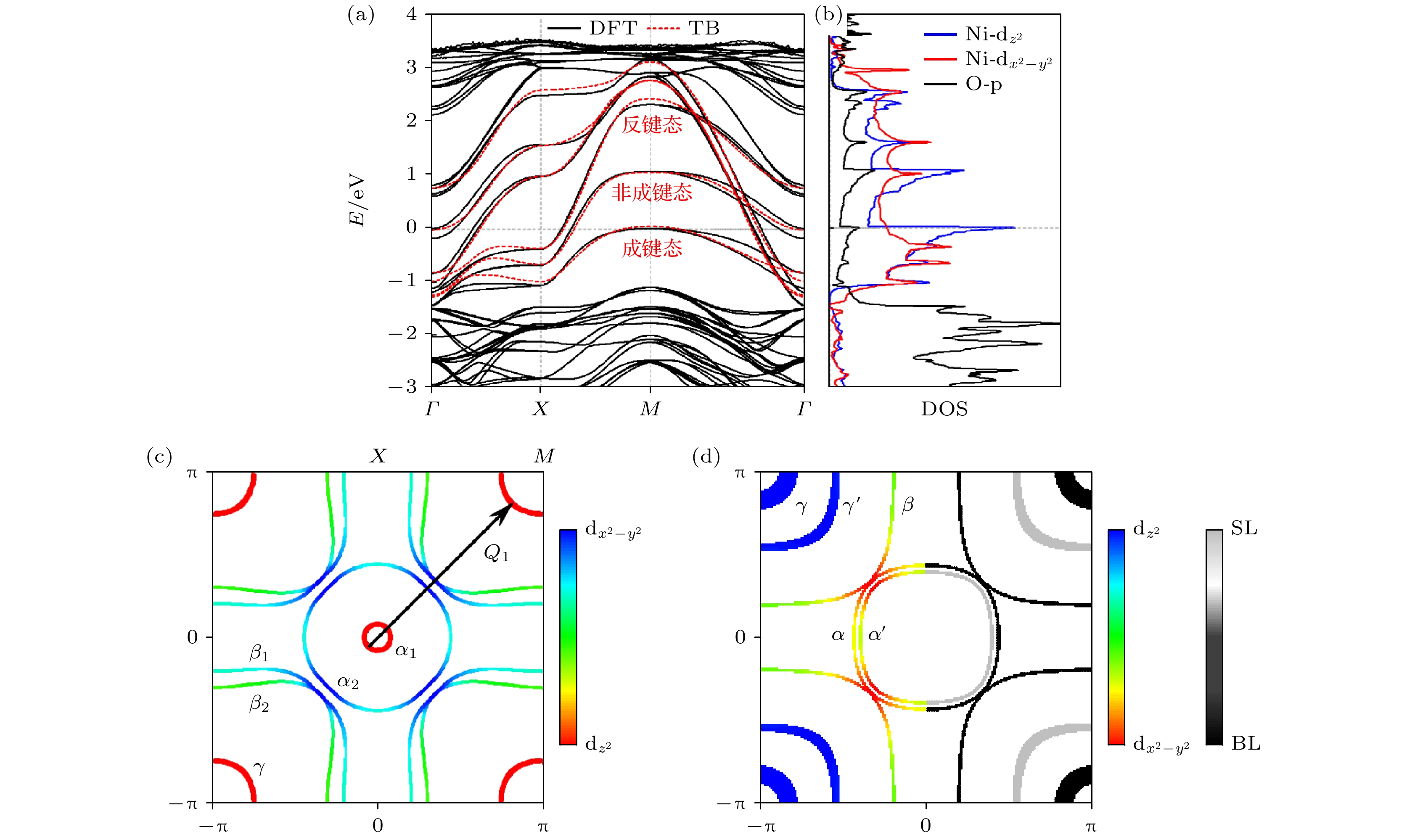 图 6 La3Ni2O7的电子结构特征 (a) 高压(29.5 GPa) 下的能带结构及各轨道成分的态密度[1] (b) 对应图(a)的费米口袋[49], 颜色表示轨道成分 (c) 低压(1.6 GPa)下的能带结构及各轨道成分的态密度[1] (d) 与图(c)对应的费米口袋[18]. (a, c)中黑色箭头指向$ d_{z^2} $轨道成键态能带 (e) 常压下$ d_{z^2} $轨道成键态能带(即γ)位于费米能级以下的ARPES实验证据[18] (f) Ni-$ d_{x^2-y^2} $轨道和Ni-$ d_{z^2} $轨道通过与O-$ p_{x, y} $轨道和O-$ p_{z} $轨道杂化成键[1] (g) 原胞内二个Ni原子的3d电子能级结构与占据情况[1]