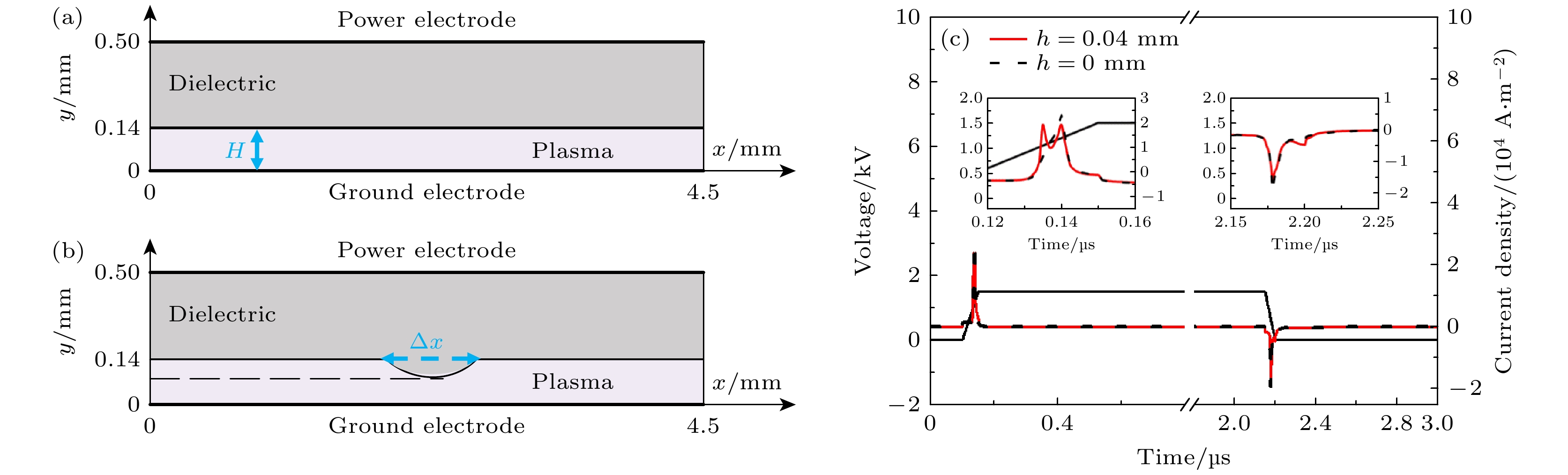 本文基于二维流体模型, 以平行板结构为基础, 对高压电极介质表面具有微结构的大气压氧气脉冲放电进行了研究, 重点分析了微结构诱导的混合放电及其增强机制. 微结构的存在导致放电过程中电场畸变, 电子在横向电场的作用下被局域束缚在微结构下方区域, 放电呈现出电晕模式; 同时由于凸起微结构的存在, 该处放电间隙减小, 纵向电场显著增强, 从而引起微结构下方电晕放电与两侧平板放电产生放电时间上的不一致性. 随着表面凸起微结构几何参数的增大, 可进一步诱发二次放电. 仿真结果表明, 电晕放电的存在有效提高了电子密度、电子温度及高能电子的数量占比, 增强了放电; 高凸起条件电晕放电受到抑制的情况下, 二次放电的产生, 有效提高了高能电子的数量占比及空间内活性氧原子的平均数密度. 这些发现为微结构引发的放电增强微观机制提供了深刻见解, 为设计高效的等离子体装置提供理论基础.In order to investigate the enhancement mechanism of atmospheric-pressure oxygen pulsed discharge in a parallel-plate dielectric barrier discharge (DBD) with microstructures fabricated on the dielectric surface of the high-voltage electrode, this work systematically analyzes the electron transport processes, the formation and evolution of electric fields, and the spatial distribution of particles by using a two-dimensional fluid model. The introduction of microstructures can cause significant electric field distortion, generating a strong transverse electric field that locally confines and focuses electrons beneath the micro-structured region, leading to the formation of a stable corona-mode discharge. At the same time, the reduced local discharge gap near the microstructure enhances the longitudinal electric field, resulting in a temporal asynchrony between the corona discharge under the microstructure and the parallel-plate discharge in the adjacent flat regions. As the geometric dimensions of the microstructures increase, a secondary discharge is triggered, further modulating the overall discharge behavior. Under conditions where the corona discharge is suppressed by higher protrusions, the occurrence of secondary discharge effectively increases the proportion of high-energy electrons and the spatially averaged density of reactive oxygen atoms. Simulation results reveal that the corona discharge and the secondary discharge significantly raise electron density, electron temperature, and the proportion of high-energy electrons, thereby intensifying the discharge activity. These findings offer deep insight into the micro-mechanisms of microstructure-induced discharge enhancement and provide valuable guidance for designing highly efficient plasma devices with tailored geometric features.