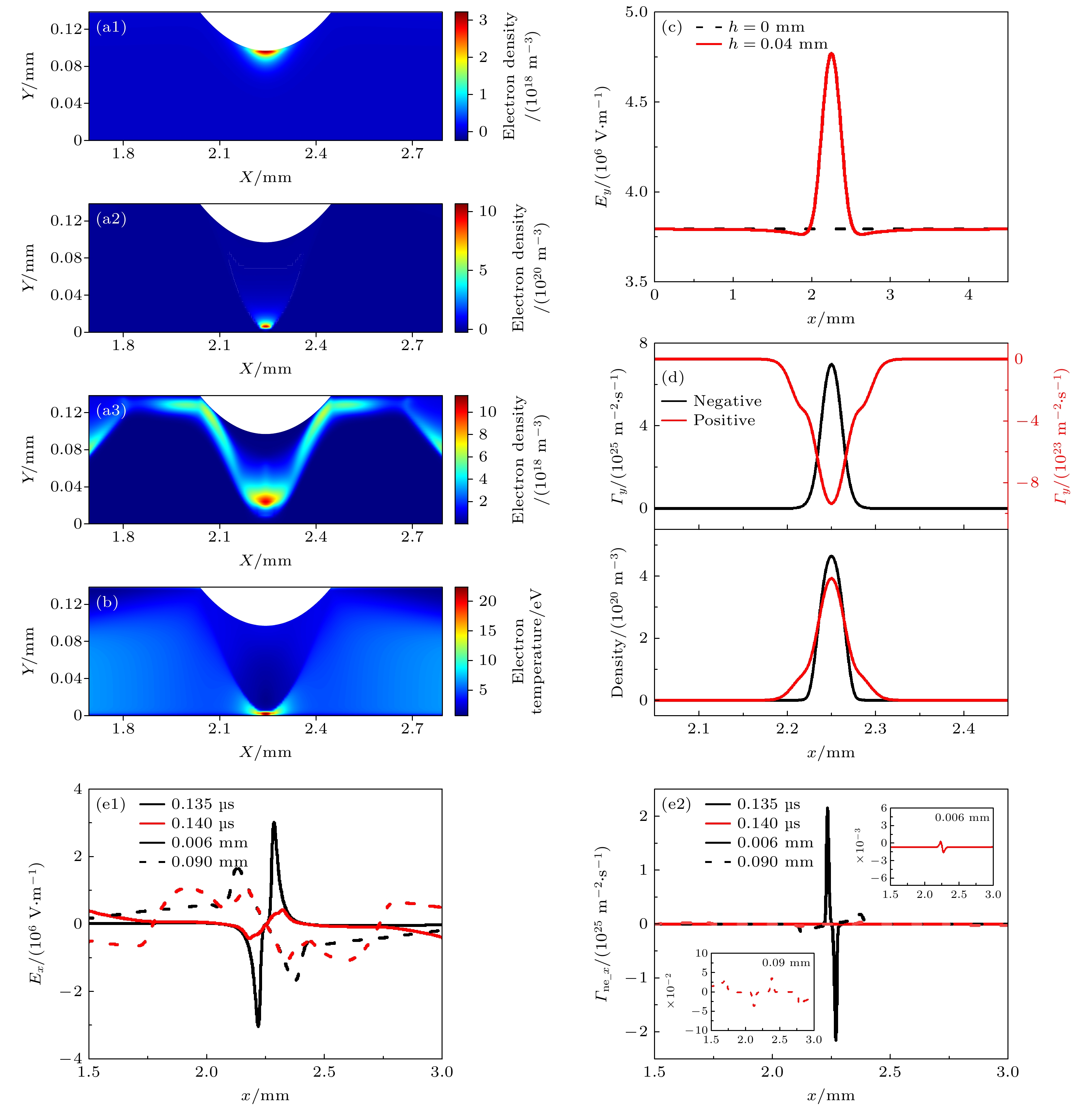 图 2 (a1)—(a3) 电晕空间0.131, 0.135, 0.140 μs电子密度空间演化; (b) 0.140 μs“类电晕空间”电子温度空间分布; (c) y = 0.006 mm, 0.135 μs的纵向电场(Ey)分布; (d) y = 0.006 mm, 0.135 μs的纵向通量及正负粒子的空间分布; (e1), (e2) 放电过程中的横向电场(Ex)及横向迁移
