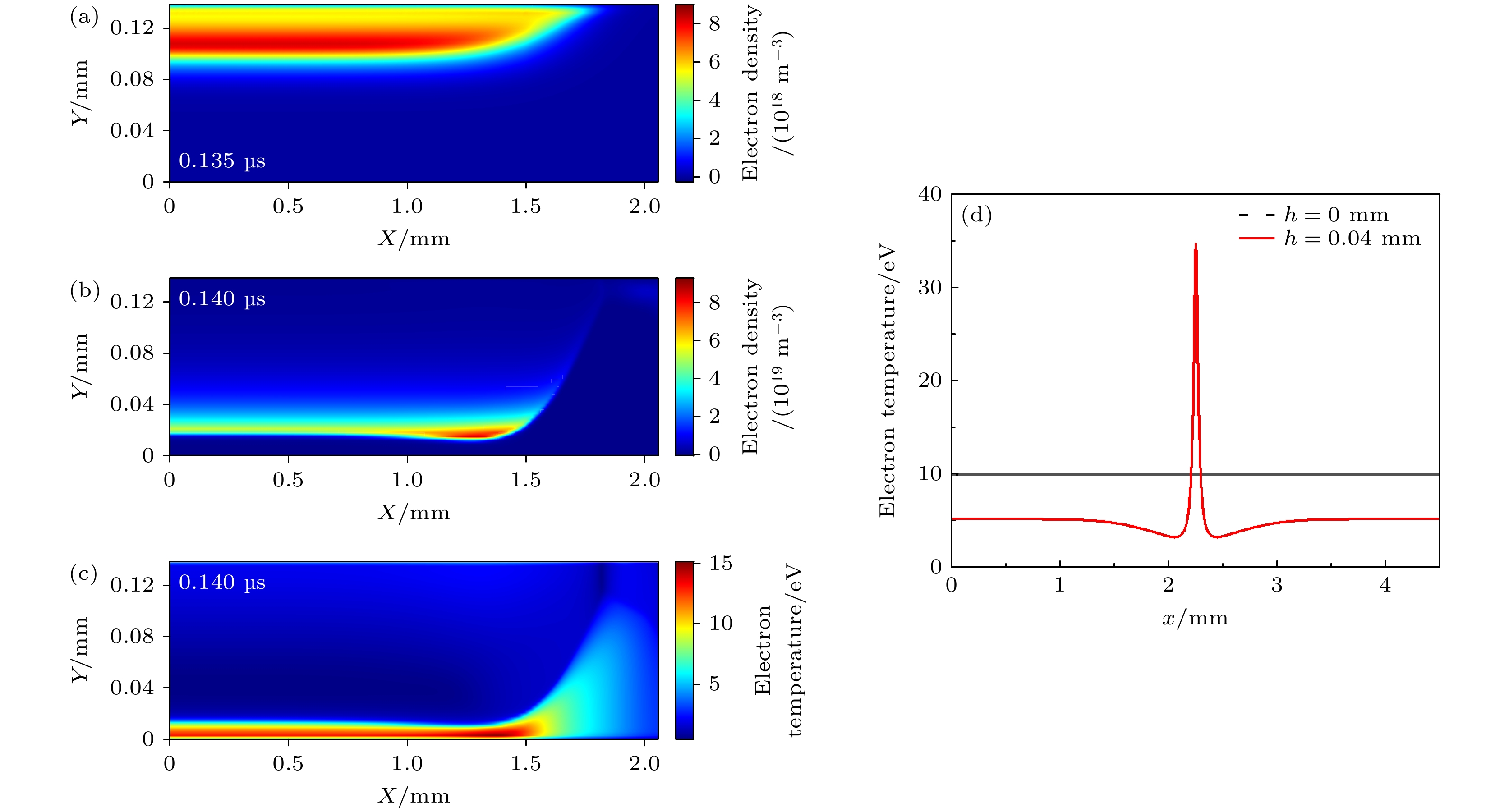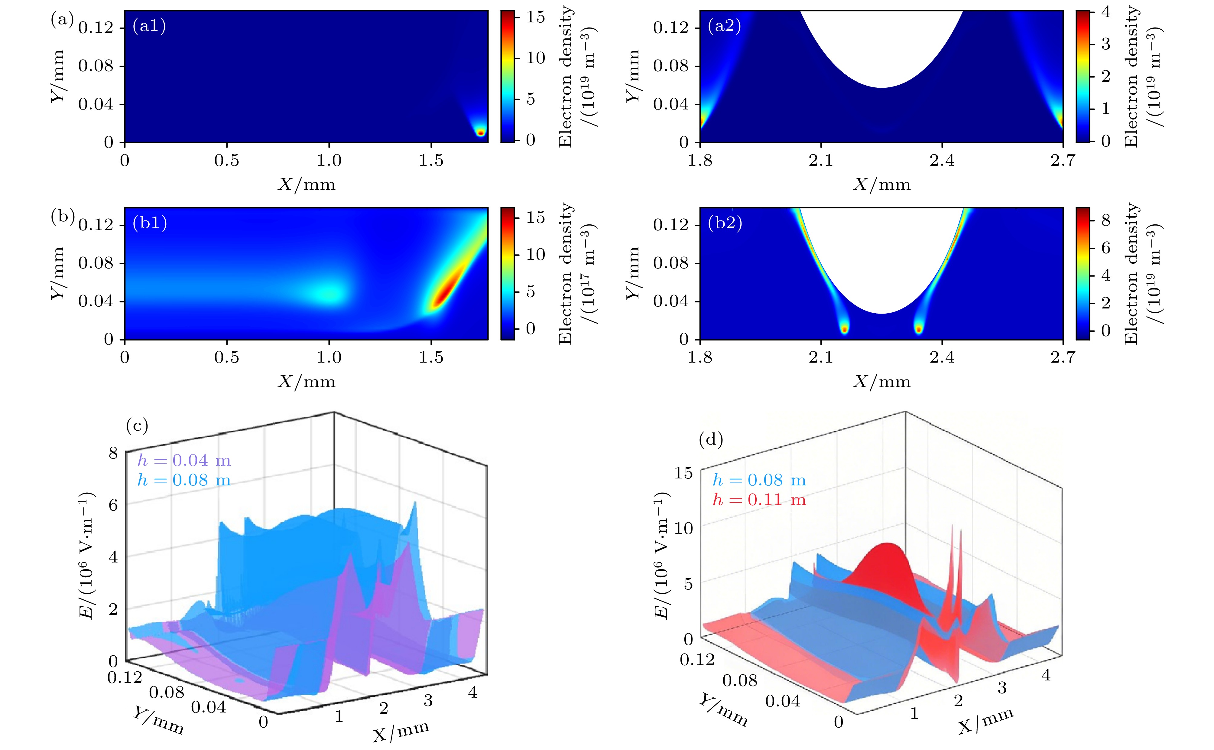 Fig. 6. (a1), (a2) Spatial electron density distribution when h = 0.08 mm and 0.157 μs; (b1), (b2) spatial electron density distribution when h = 0.11 mm and 0.151 μs; (c), (d) spatial electric field distribution.