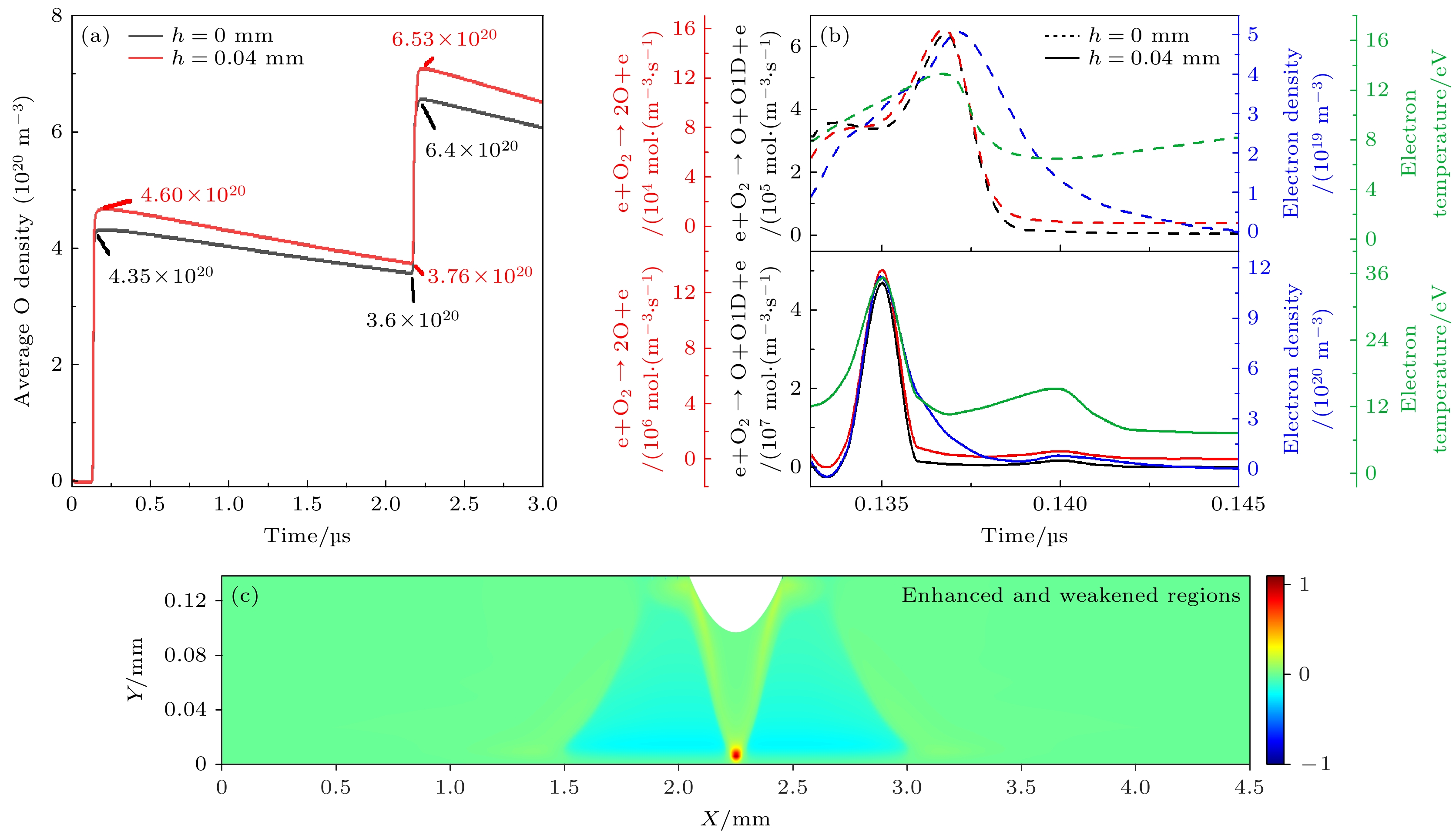 Fig. 4. (a) The spatial average oxygen density of the parallel plate structure and the surface micro-structure protrusions with a height of h = 0.04 mm; (b) reaction rate and electron temperature dependence in oxygen atom production; (c) enhanced and weakened regions of oxygen compared with parallel plate discharge.