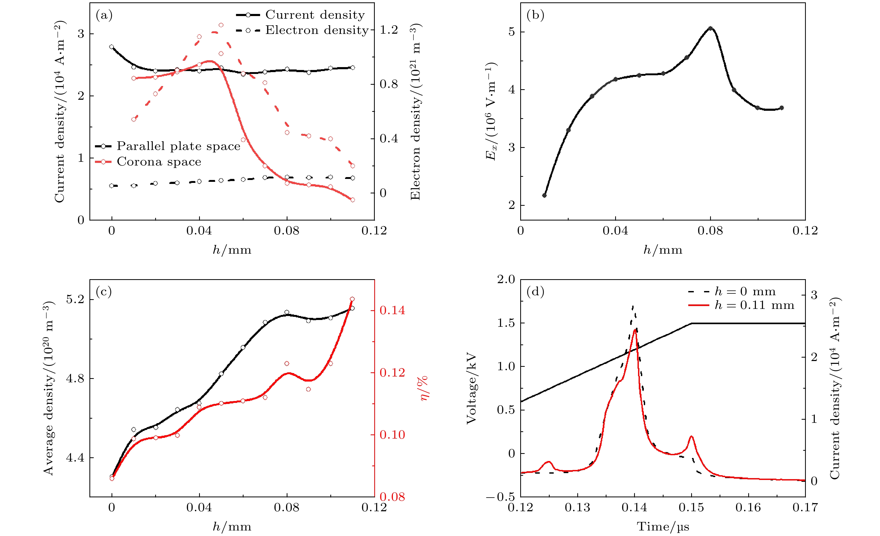 Fig. 5. (a) The variation of peak electron and current densities with h; (b) the variation of Ex with h along y = 0.02 mm; (c) the variation of spatial average oxygen density and the proportion of high-energy electrons with h; (d) the rising edge of voltage and current density at h = 0 mm and h = 0.11 mm.