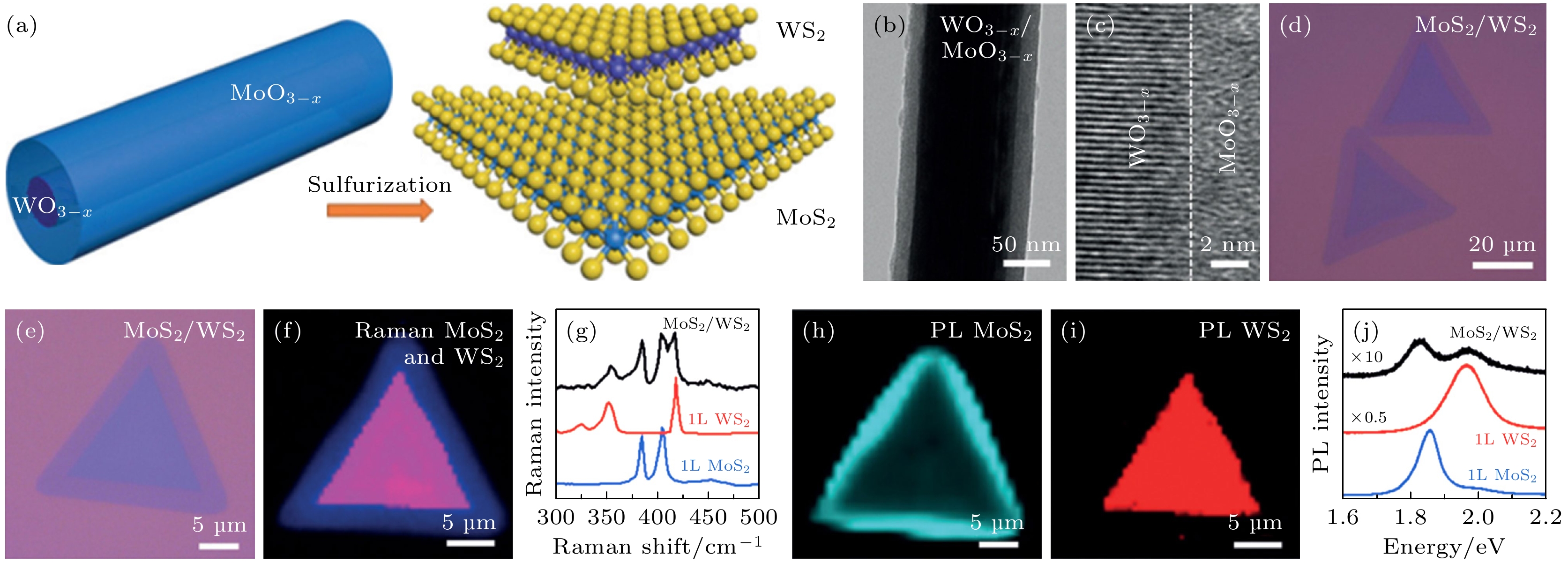 Fig. 1. (a) Atomic structure schematic of WO3–x/MoO3–x core-shell nanowires and the synthesis of MoS2/WS2 VHS; (b) TEM image of WO3–x/MoO3–x core-shell nanowires, with a core diameter of ~100 nm and shell thickness of ~20 nm; (c) HR-TEM image of the interface between WO3–x and MoO3–x; (d) OM image of the CVD-grown MoS2/WS2 VHS; (e) OM image of an individual MoS2/WS2 VHS; (f) Raman mapping image of the VHS shown in (e); (g), (j) Raman and PL spectra of monolayer MoS2, WS2, and MoS2/WS2 VHS; (h), (i) PL mapping images of the MoS2/WS2 VHS at 1.84 eV (A-exciton peak of MoS2) and 1.97 eV (A-exciton peak of WS2), respectively[152].