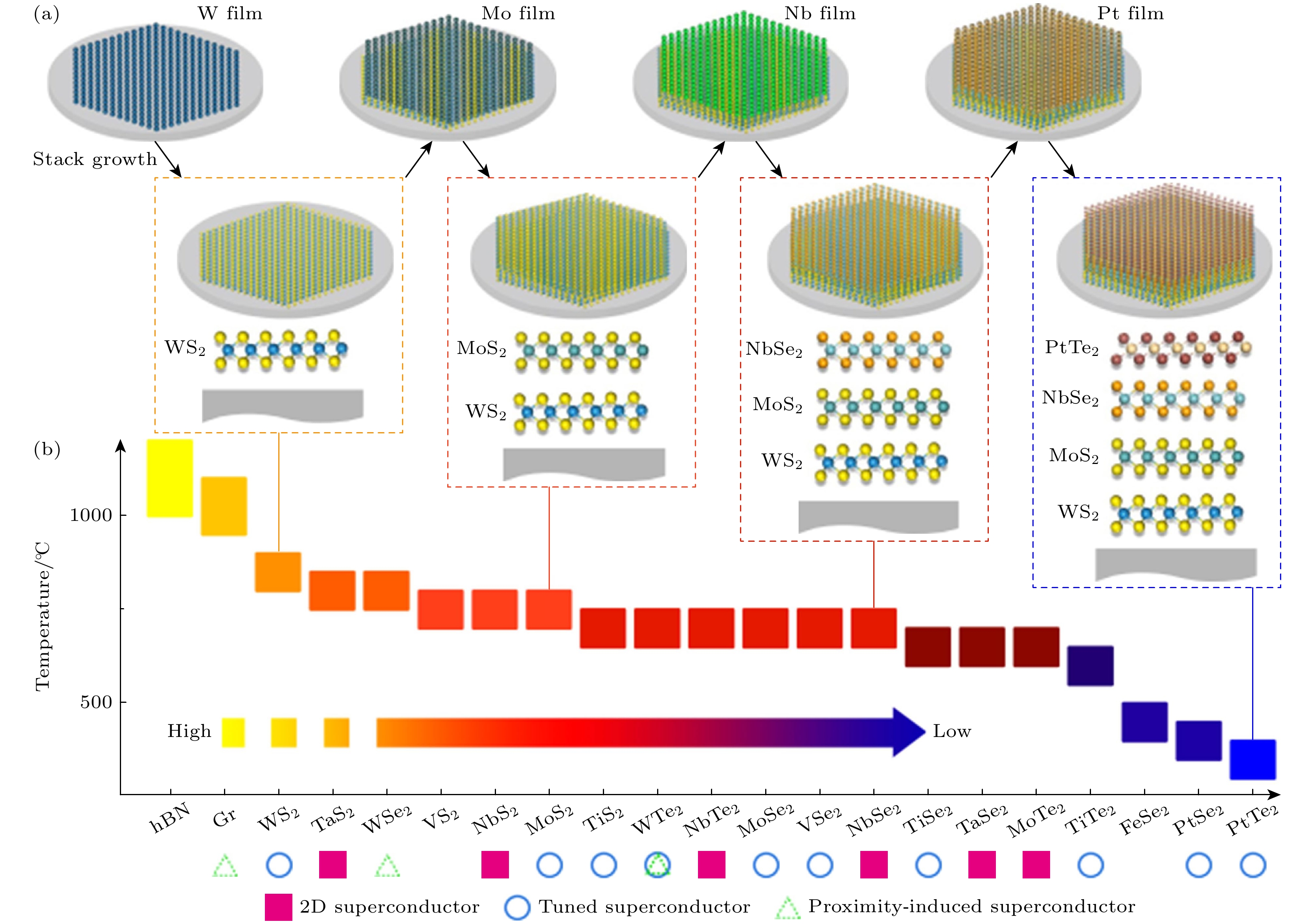 图 10 (a) 通过4个两步气相沉积循环的晶圆级四层异质结生长的示意图, 每个循环组合金属膜涂层和TMDC膜; (b) TMDC物质的排列遵循高温到低温策略, 从WS2开始, 因为这需要最高的温度. 石墨烯和hBN被显示用于比较, 这里制造的TMDC薄膜包含2D超导体、调谐超导体和邻近诱导超导体, 颜色条显示了过程中每个部分所需的温度方向[169]