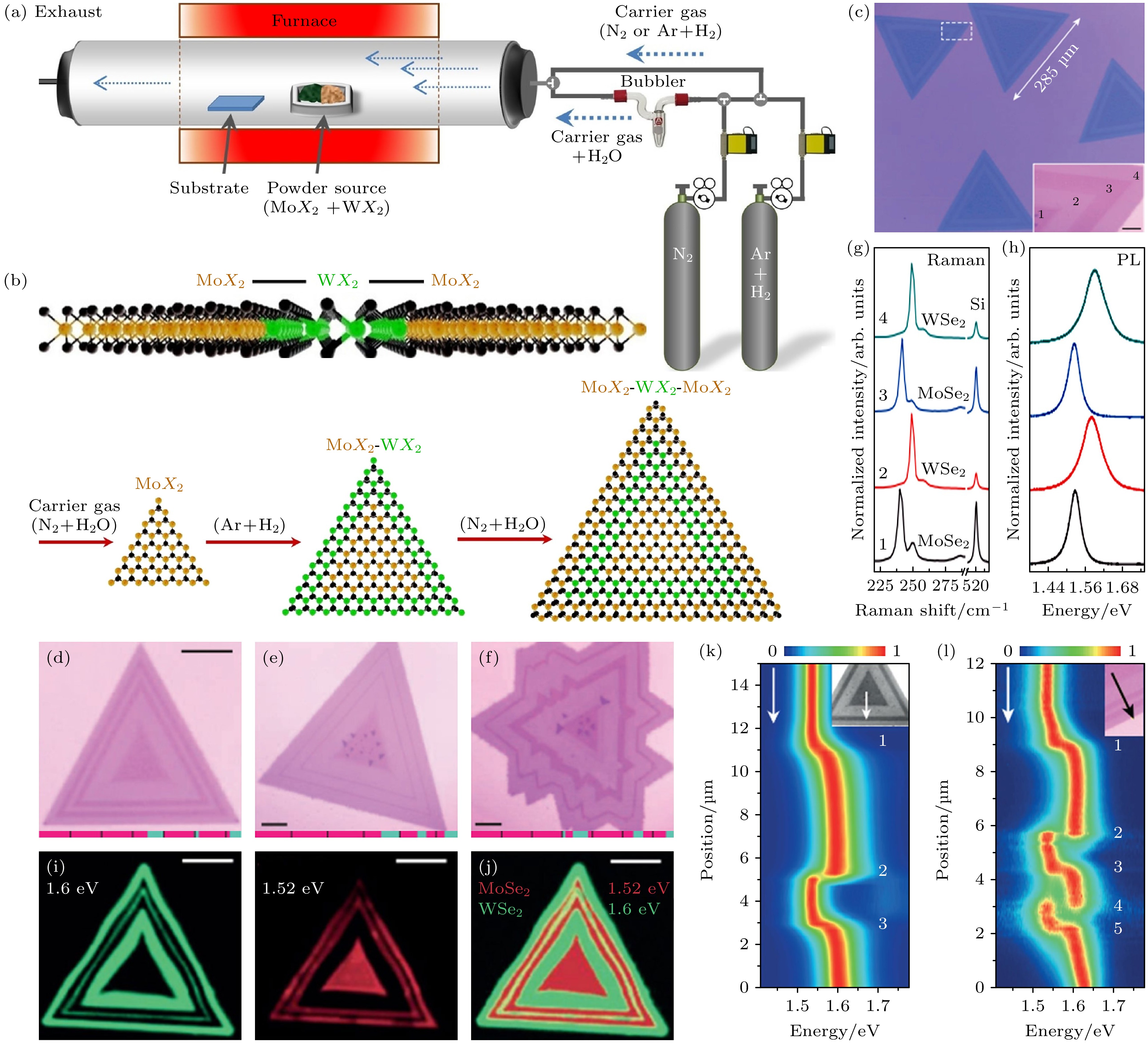 Fig. 11. (a) Schematic diagram of the modified chemical vapor deposition system, which allows alternate switching of carrier gas. The carrier gas introduces water vapor via a bubbler and is selected using a three-way valve positioned at the inlet of the quartz tube; (b) atomic ball-and-stick model showing the material distribution in the heterostructure, in both cross-sectional and planar views; (c) OM image of a triple-junction heterostructure; (d), (e) OM images of a five-junction heterostructure; (f) OM image of a seven-junction heterostructure; (g), (h) Raman (g) and PL (h) spectra taken at positions 1, 2, 3, and 4 marked in (c); (i), (j) PL maps of WSe2 (1.6 eV, top)and MoSe2 (1.52 eV, bottom), and the composite PL map (j) of the heterostructure in (d); (k), (l) Contour-colored maps of normalized PL intensity for the triple-junction (k) and five-junction (l) heterostructures[170].
