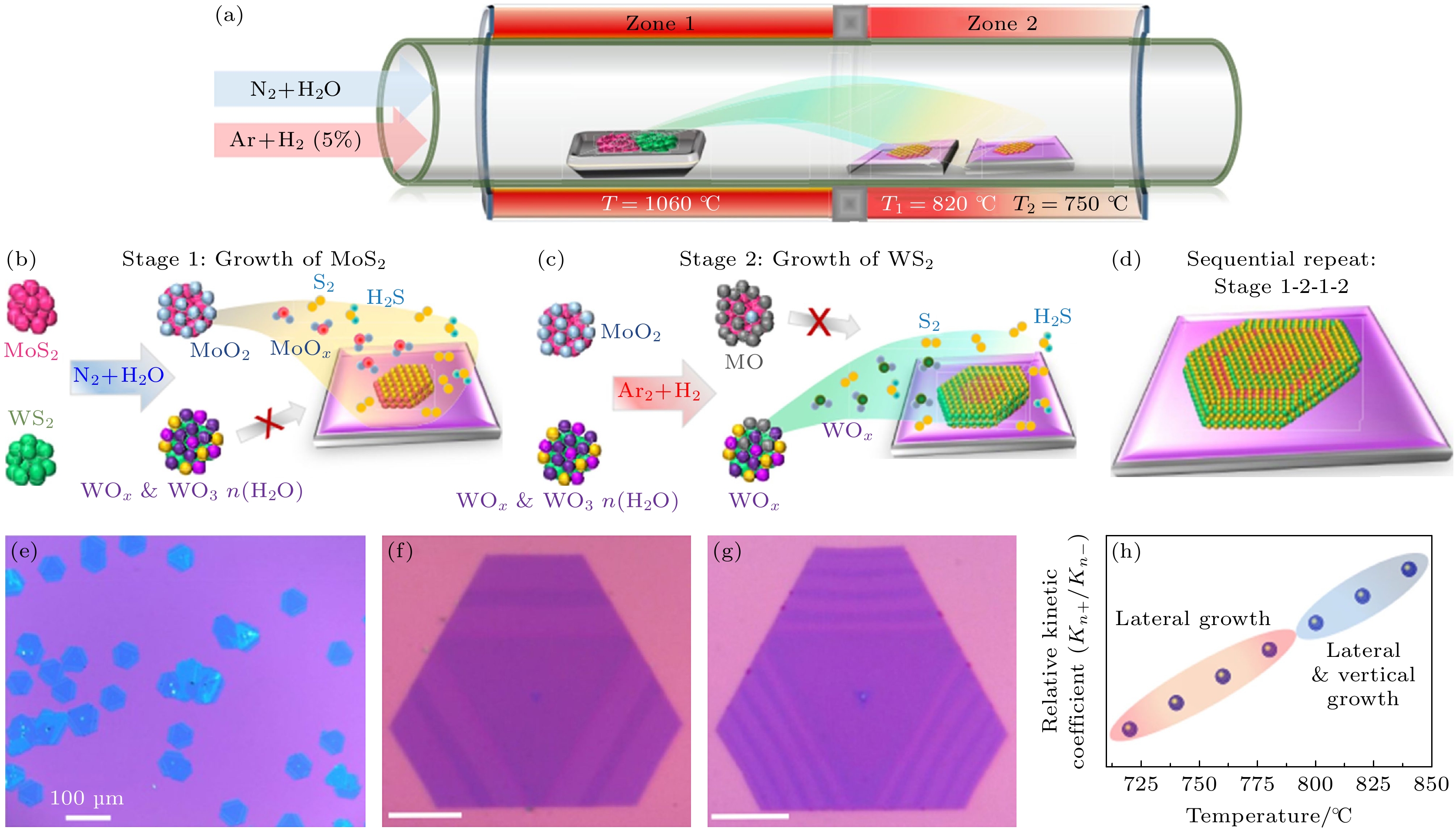 Fig. 12. (a) Schematic diagram of the CVD setup used for synthesizing MoS2/WS2 LHS; (b) MoS2 structure, (c) WS2 structure, and (d) mechanism illustration for the growth of multi-junction LHS; (e) OM image of a MoS2/WS2 LHS, along with (f) corresponding magnified view and (g) multi-junction heterostructure, showing distinct domains of MoS2 and WS2; (h) Kn+/Kn– as a function of temperature, indicating a transition from purely lateral growth to a combination of LHS and VHS growth with increasing temperature[171].