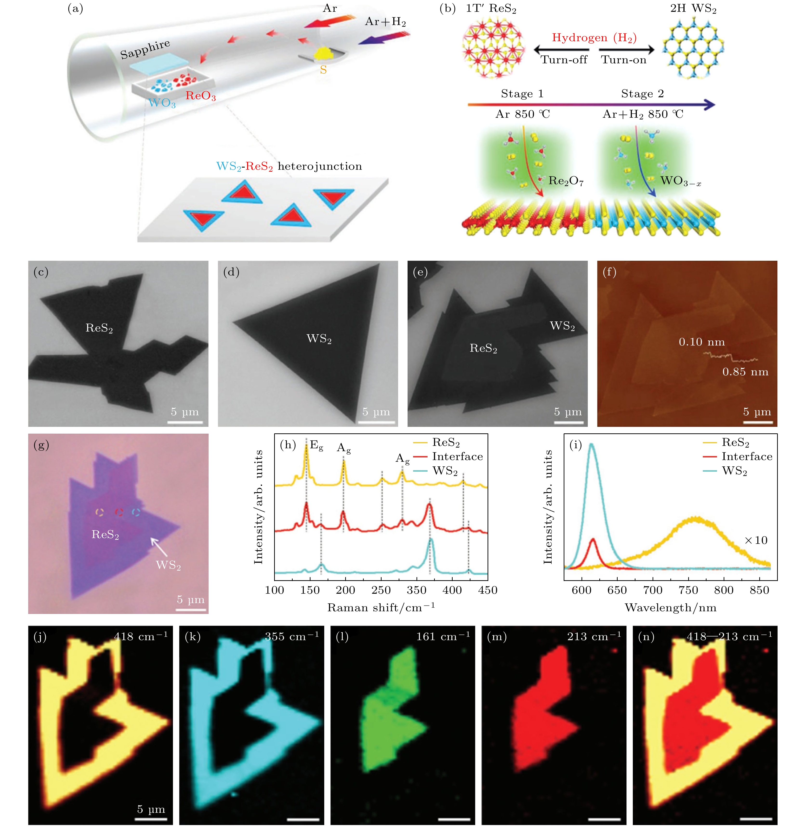 Fig. 13. (a) Schematic illustration of the one-pot CVD synthesis of WS2/ReS2 LHS; (b) atomic model of the hydrogen-triggered one-pot growth process for the heterostructure; (c) SEM image of ReS2 grown under Ar atmosphere; (d) SEM image of WS2 grown under Ar+H2 atmosphere; (e), (f) SEM and corresponding AFM images of WS2/ReS2 LHS grown first under Ar atmosphere and then under Ar+H2 atmosphere; (g) OM image of the WS2/ReS2 LHS; (h) Raman spectrum of the WS2/ReS2 heterostructure; (i) corresponding PL spectra obtained from the three marked regions of the heterostructure; (j)–(m) Raman mapping images acquired at 418, 355, 161, and 213 cm–1; (n) composite Raman mapping image formed by integrating two distinct Raman peaks at 213 and 418 cm–1[127].