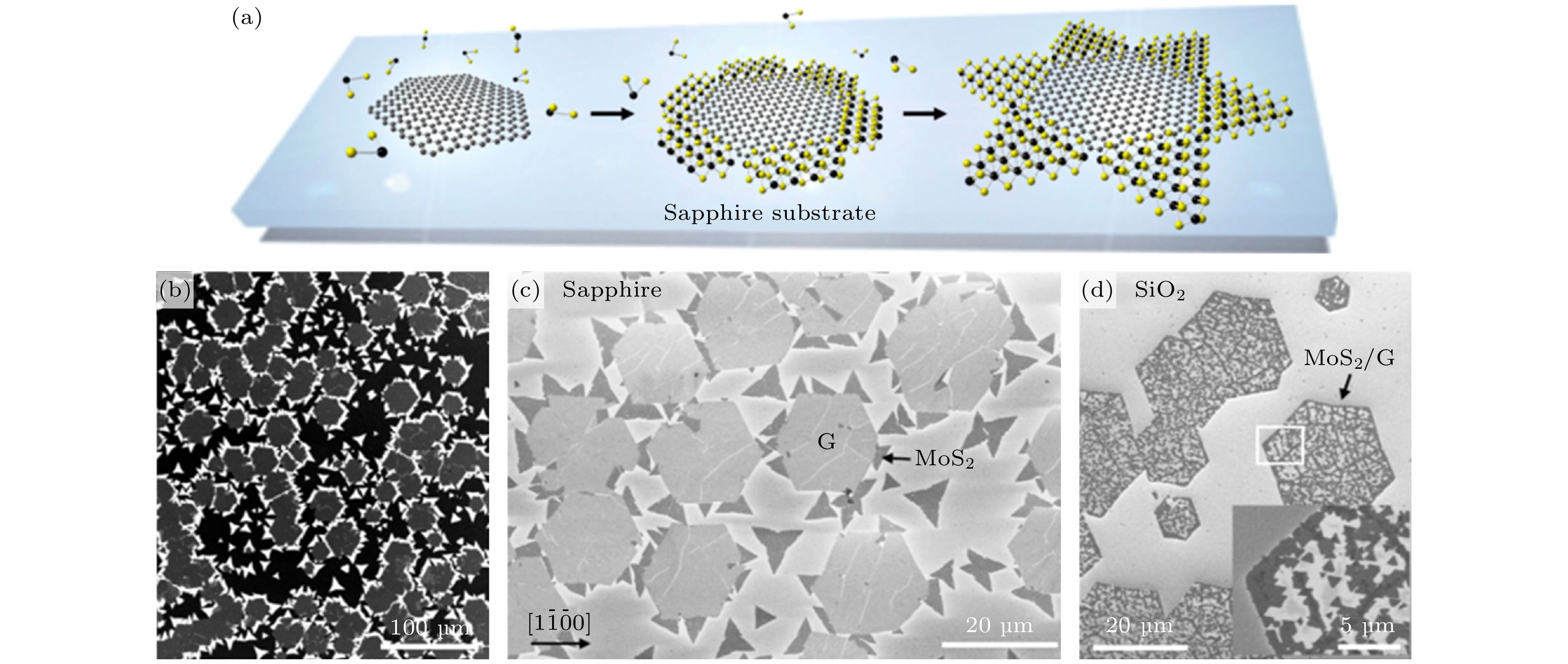 图 14 (a) MoS2/石墨烯面LHS的合成示意图; (b) 在蓝宝石衬底上生长的LHS的CLSM和(c) SEM图像; (d) 当使用SiO2代替蓝宝石作为衬底时获得的MoS2/石墨烯VHS结构的SEM图像[177]