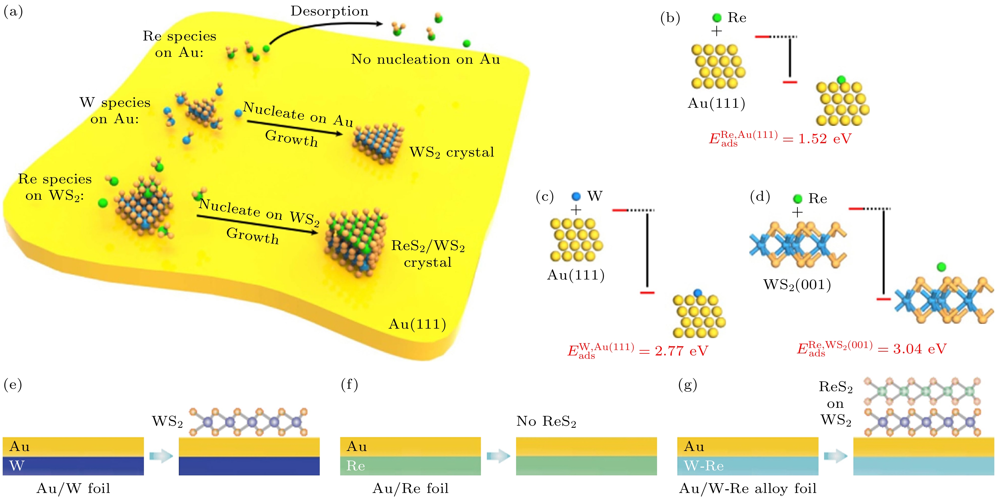 Fig. 15. (a) Schematic illustration of the growth process of ReS2/WS2 heterostructures on the Au(111) surface; (b)–(d) side views of the simulated adsorption configurations of Re atoms (b) and W atoms (c) on the Au(111) surface, and of Re atoms on the WS2(001) surface (d); (e)–(g) schematics of growth on Au using W foil (e), Re foil (f), and W-Re alloy foil (g) as support substrates[178].