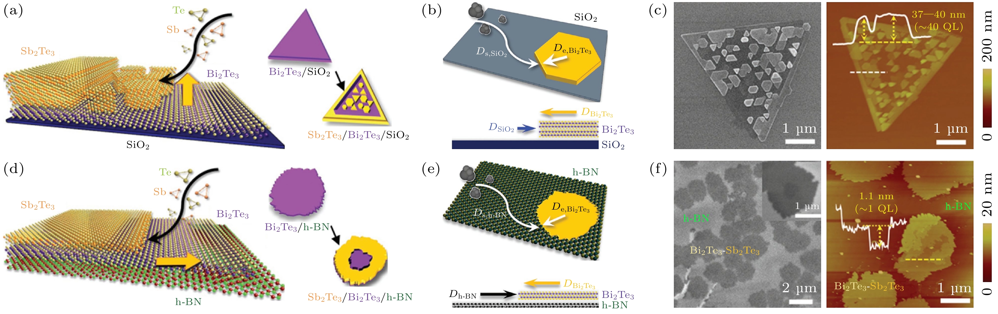 Fig. 16. (a) Schematic diagram of the sequential two-step stacking growth of Sb2Te3/Bi2Te3 on SiO2/Si substrate; (b) schematic illustration of the bottom-layer Bi2Te3 growth on SiO2/Si substrate; (c) OM and AFM images of the Sb2Te3/Bi2Te3 VHS on SiO2/Si substrate; (d) schematic diagram of the growth of Sb2Te3/Bi2Te3 VHS on h-BN substrate; (e) schematic illustration of the bottom-layer Bi2Te3 growth on h-BN substrate; (f) OM and AFM images of the Sb2Te3/Bi2Te3 VHS on h-BN substrate[143].