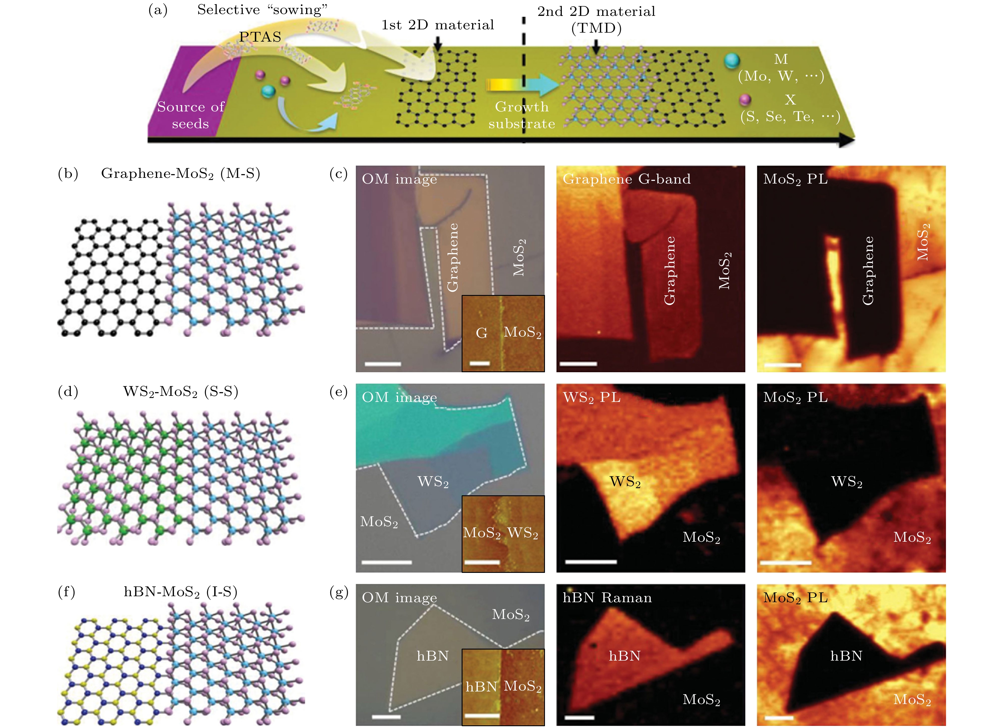 图 17 (a) CVD装置和平行缝合2D-TMD异质结构的合成过程的示意图; (b), (d), (f)石墨烯/MoS2 (b), WS2/MoS2 (d)和hBN/MoS2 (f)的平行缝合异质结构的示意图; (c), (e), (g)对应于图(b), (d), (f)的光学图像和PL面扫描图像[180]
