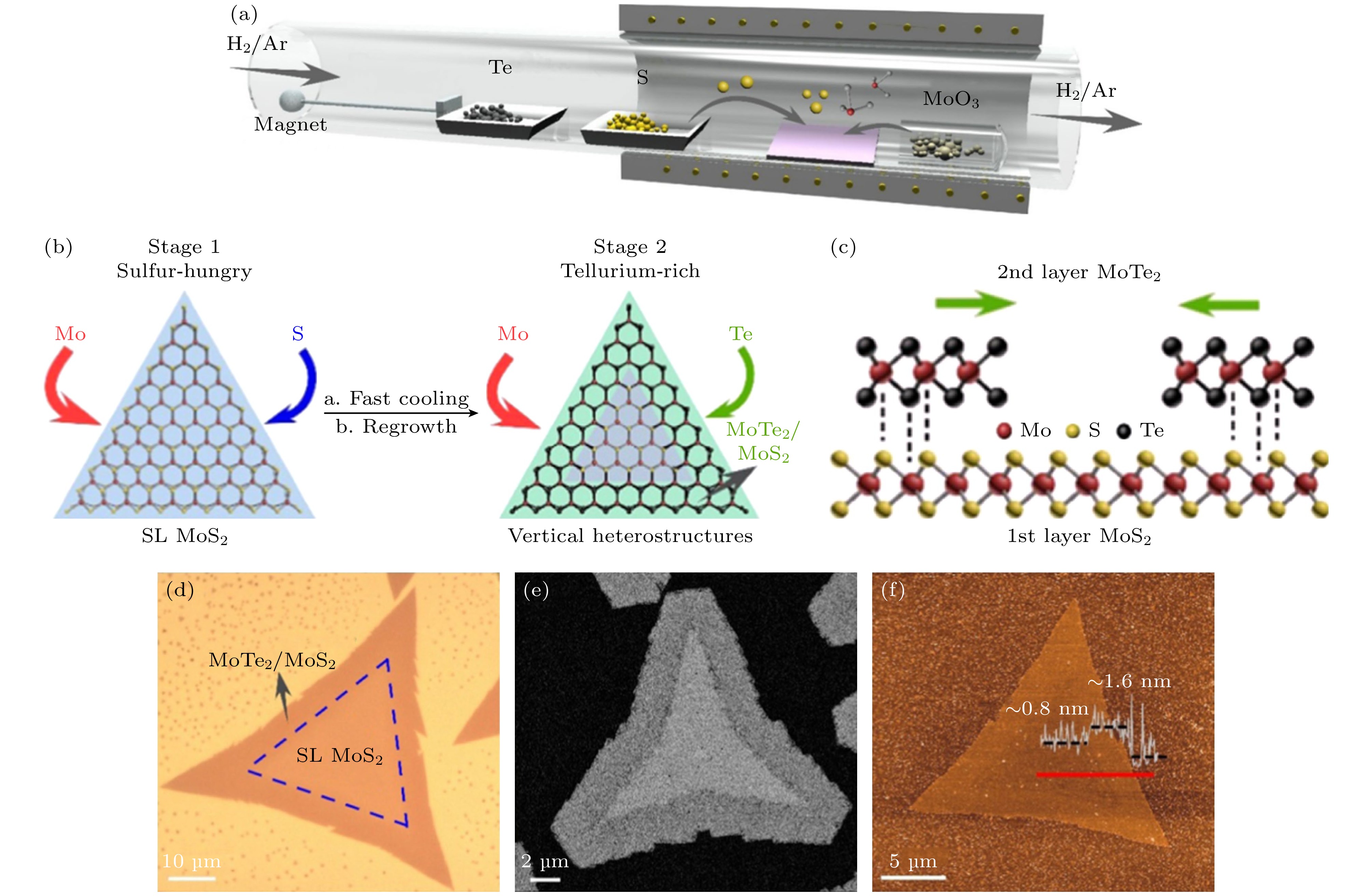 Fig. 2. (a) Schematic of the magnetic-field-assisted CVD quartz tube; (b) growth of the bottom-layer MoS2 in the first stage, followed by rapid cooling and introduction of Te to form a MoTe2/MoS2 VHS; (c) schematic side view of the MoTe2/MoS2 VHS; (d) OM image of the MoTe2/MoS2 VHS; (e) backscattered SEM image of the MoTe2/MoS2 VHS; (f) AFM characterization of the MoTe2/MoS2 VHS in panel (d)[134].