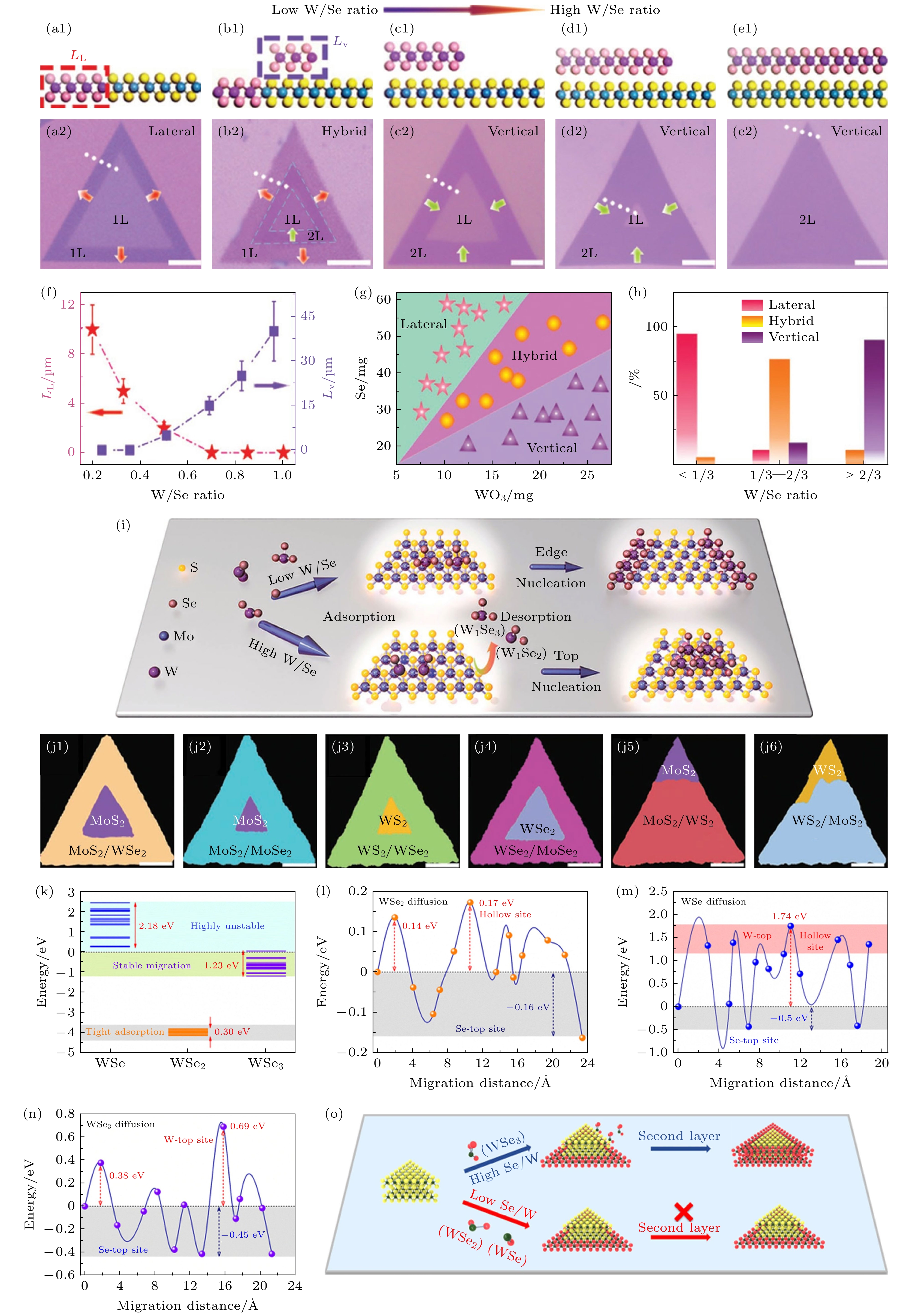 Fig. 3. (a1)–(e2) Schematic diagrams illustrating the continuous evolution of the MoS2/WSe2 heterostructure morphology, which transitions from being LHS-dominated to VHS-dominated with an increasing W/Se ratio; (f) the evolution trends of lateral and vertical growth length with composition ratio of W/Se; (g) the relation of heterostructure type with the dosage of W precursor (WO3) and Se precursor; (h) the statistics of LHS, HHS, and VHS at different W/Se ratios; (i) schematic view of controllable growth process of MoS2/WSe2 LHS/VHS with the adsorption of various active clusters W1SeX; (j) spatially resolved Raman mapping image of diverse VHS[153]; (k) binding energies of the active clusters on the different positions of the WSe2 surface; (l) diffusion behavior of the WSe2 active cluster on the WSe2 surface; (m) diffusion behavior of the WSe active cluster on the WSe2 surface; (n) diffusion behavior of the WSe3 active cluster on the WSe2 surface; (o) schematic view of the growth process of bilayer-bilayer and bilayer-monolayer WS2/WSe2[149].
