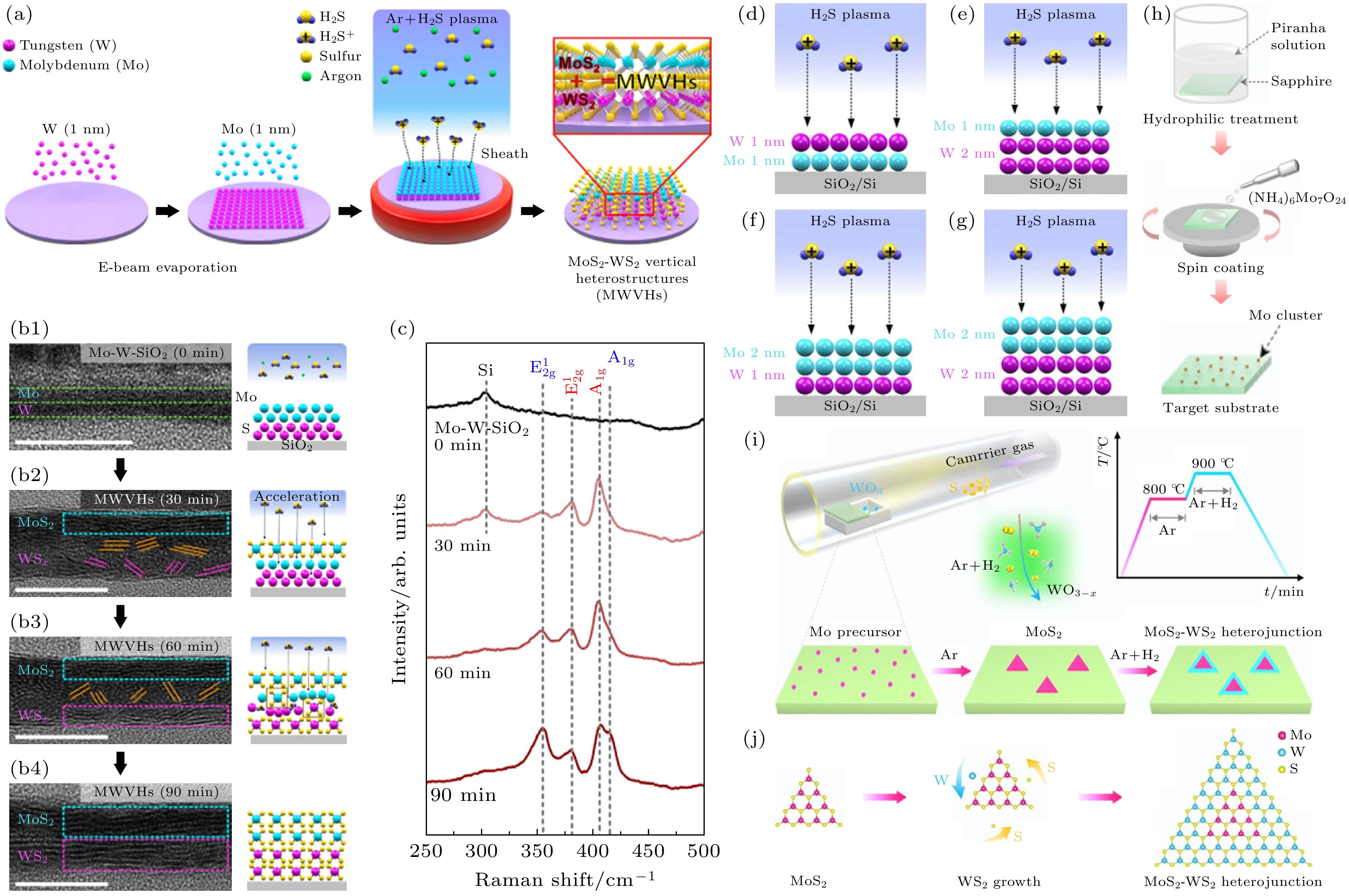 Fig. 4. (a) Schematic illustration of one-step through-plane sulfurization via PECVD at 300 ℃ for synthesizing MoS2/WS2 VHS; (b) cross-sectional HR-TEM images revealing the time-dependent plasma-assisted sulfurization mechanism; (c) Raman spectra under varying sulfurization durations; (d) schematic of the synthesis process for WS2/MoS2 VHS; (e)–(g) through-plane H2S plasma process with different metal thicknesses: (e) Mo 1 nm/W 2 nm, (f) Mo 2 nm/W 1 nm, (g) Mo 2 nm/W 2 nm[155]; (h) schematic showing the dispersion of Mo solution precursor on a sapphire substrate via spin-coating; (i) illustration of one-pot CVD synthesis of MoS2/WS2 LHS triggered by hydrogen; (j) atomic structure model of the epitaxial growth process of a MoS2/WS2 LHS[156].