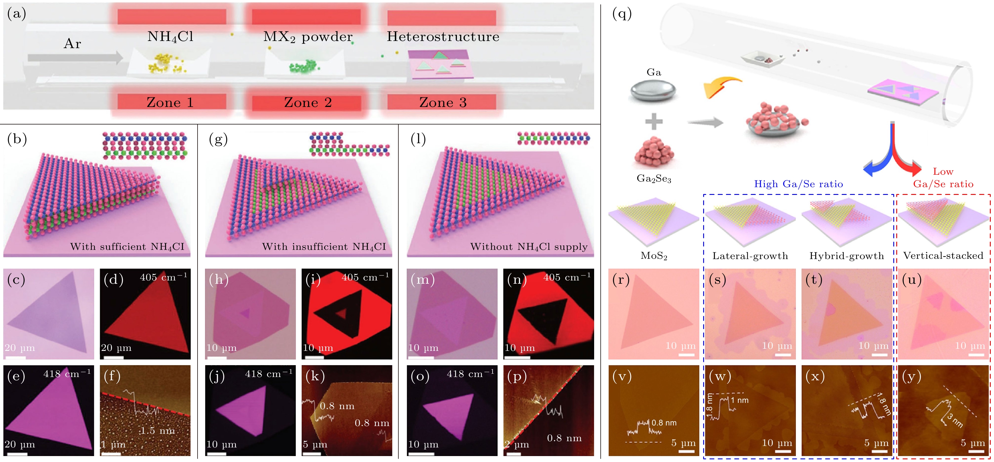 Fig. 5. (a) Schematic diagram of the CVD process using an auxiliary-agent-modified precursor; (b)–(f) atomic structure diagram, OM, Raman mapping, and AFM images of MoS2/WS2 VHS grown with sufficient NH4Cl supply; (g)–(k) atomic structure, OM, Raman mapping, and AFM images of MoS2/WS2 HHS grown under insufficient NH4Cl supply; (i)–(p) atomic structure diagram, OM, Raman mapping, and AFM images of MoS2/WS2 LHS obtained in the absence of NH4Cl[159]; (q) reaction system based on a precursor composite of liquid Ga and Ga2Se3 powder, along with the corresponding atomic structure of a GaSe/MoS2 heterostructure; (r)–(u), (v)–(y) OM and AFM images of monolayer MoS2, GaSe/MoS2 LHS, HHS and VHS[160].