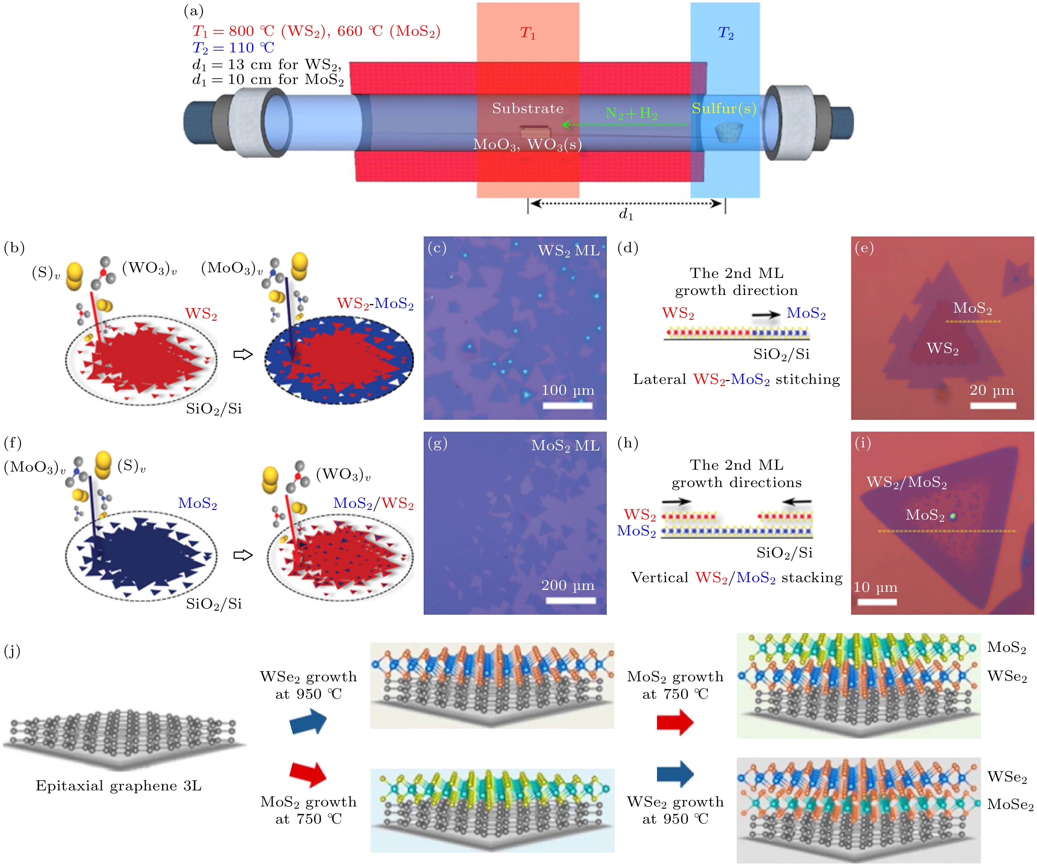 Fig. 6. (a) Growth system for WS2/MoS2 LHS and VHS; (b) schematic illustration of the growth of a WS2/MoS2 LHS; (c) OM image of a large-area monolayer WS2; (d) growth mechanism diagram of the WS2/MoS2 LHS; (e) OM image of an individual WS2/MoS2 LHS; (f) schematic illustration of the growth of a WS2/MoS2 VHS; (g) OM image of a large-area monolayer MoS2; (h) growth mechanism diagram of the WS2/MoS2 VHS; (i) OM image of an individual WS2/MoS2 VHS[163]; (j) formation of MoS2/WSe2/EG or WSe2/MoSe2/EG VHS[164].