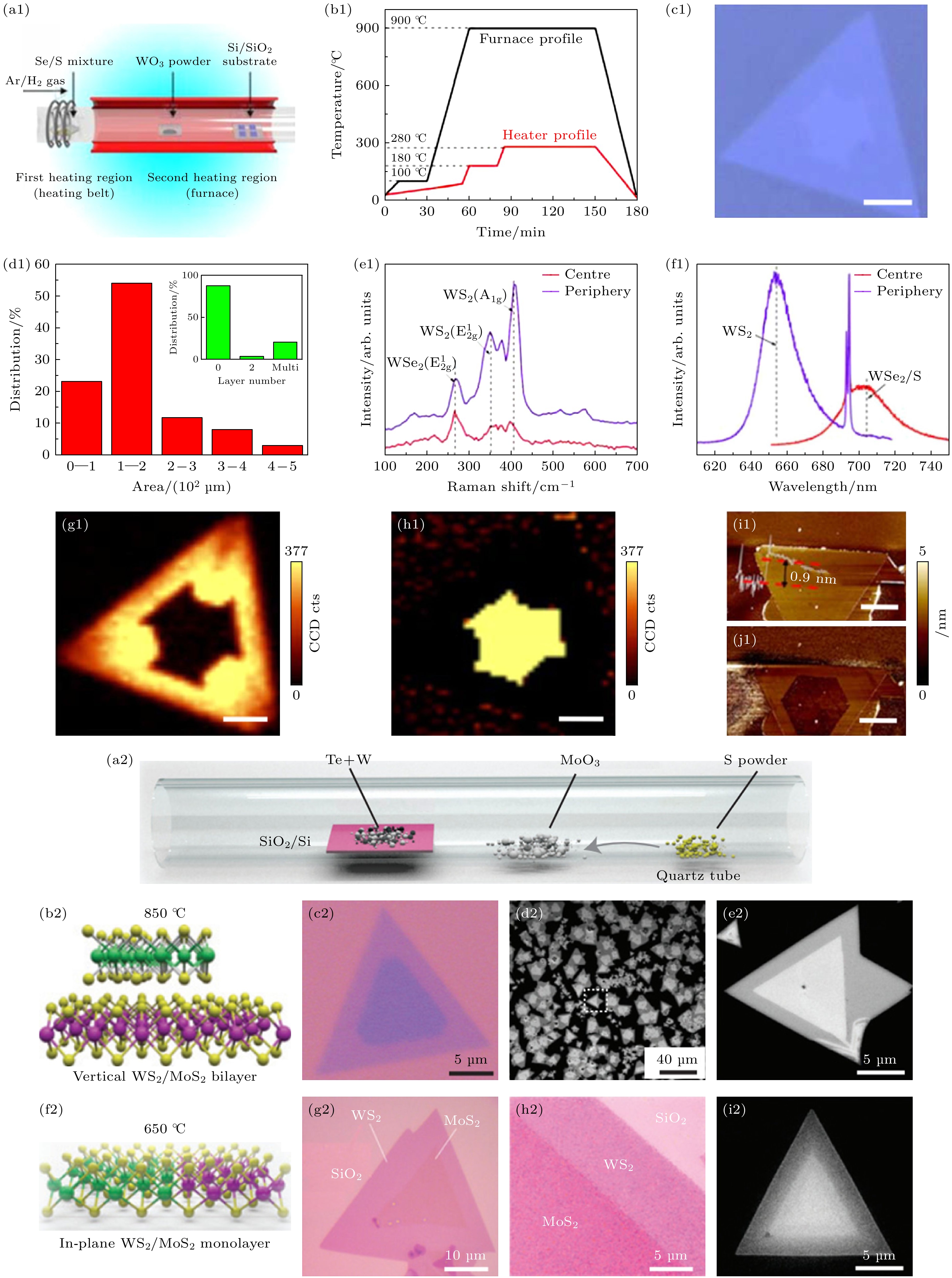 Fig. 7. (a1) Schematic of the CVD system for synthesizing WSe2/WS2 LHS; (b1) temperature profiles of the first and second heating zones; (c1) OM image of the WSe2/WS2 LHS; (d1) size and thickness distribution of the WSe2/WS2 LHS; (e1) Raman spectra acquired from the center and edge regions of the WSe2/WS2 heterostructure; (f1) PL spectra of the heterostructure at the center and edge regions; (g1), (h1) Raman mapping images of the WS2 (g1) and WSe2 $ {E}_{1\mathrm{g}}^{2} $ (h1) vibration modes in the heterostructure; (i1) AFM topographic image of the heterostructure; (j1) phase image of the heterostructure[165]; (a2) schematic illustration of the synthesis process for the two types of heterostructures; (b2)–(e2) schematic diagram, OM, and SEM images of WS2/MoS2 VHS synthesized at 850 ℃, demonstrating the characteristics and high yield of the heterostructures; (f2)–(i2) schematic diagram, OM, and SEM images of WS2/MoS2 LHS grown at 650 ℃; (h2) OM image of the interface between WS2 and MoS2 with enhanced color contrast, showing an abrupt change in contrast at the boundary[166].