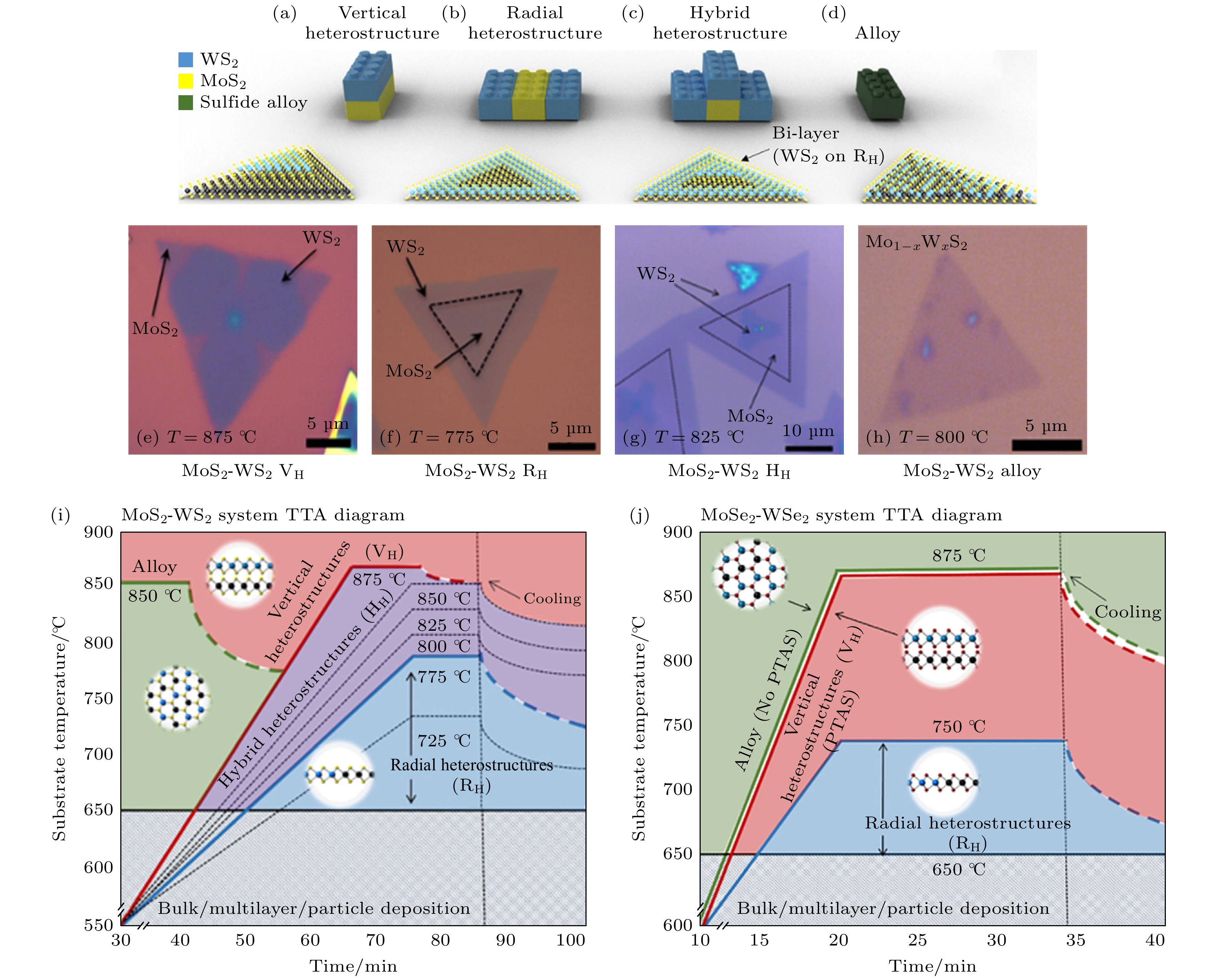 Fig. 8. (a)–(d) Schematic diagrams of the crystal structures of heterostructures and alloys; (e)–(h) OM images of MoS2/WS2 VHS, LHS, HHS, and alloys, corresponding to their respective final growth temperatures; (i) TTA diagram of the MoS2/WS2 system; (j) TTA diagram of the MoSe2/WSe2 system[167].
