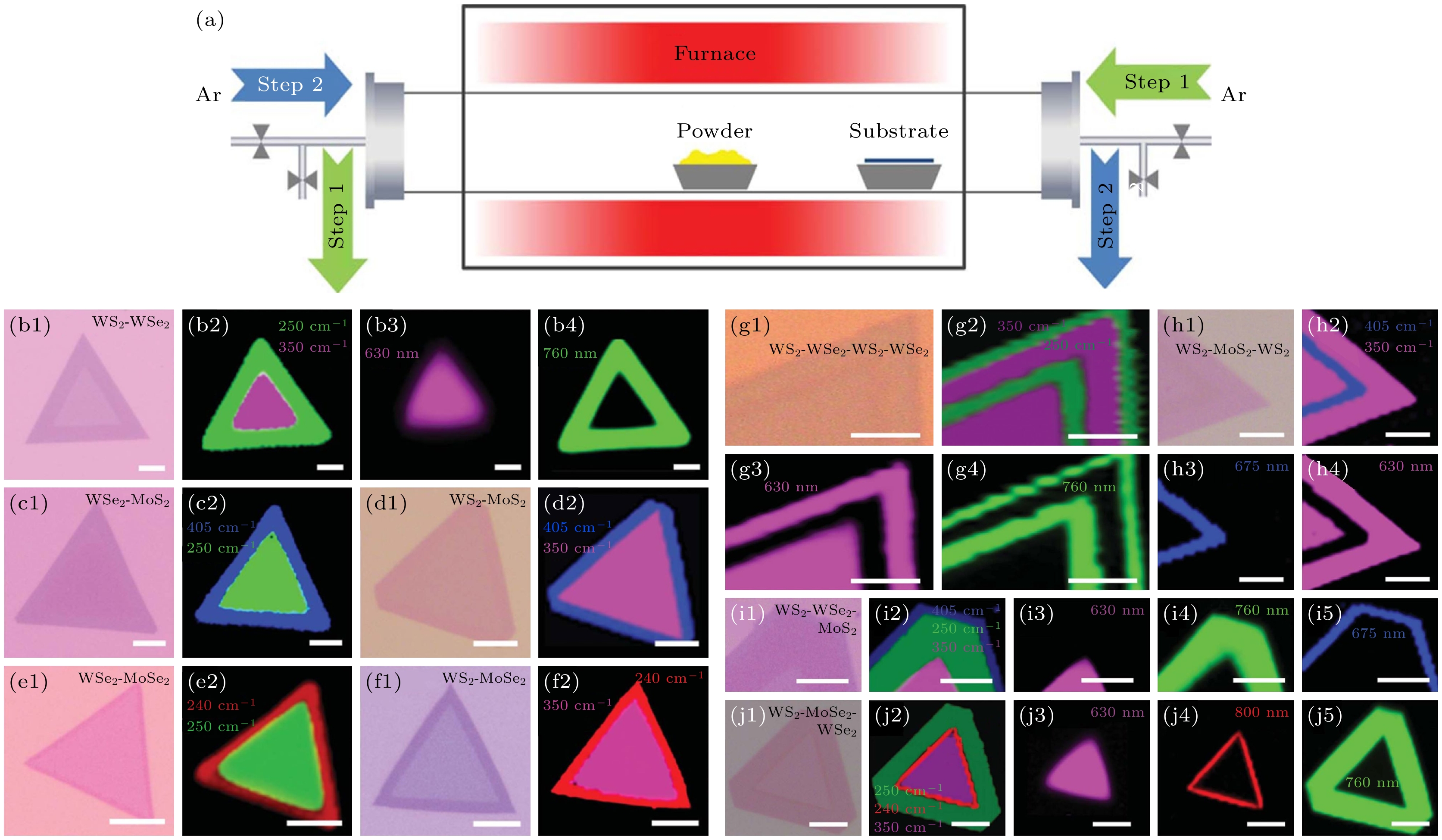 Fig. 9. (a) Schematic diagram of the modified counter-flow CVD system; (b1) OM image of the WS2/WSe2 LHS; (b2) Raman mapping image of the WS2/WSe2 LHS; (b3), (b4) PL mapping images of the WS2/WSe2 LHS; (c1), (c2) OM image and PL mapping image of the WSe2/MoS2 LHS; (d1), (d2) OM image and PL mapping image of the WS2/MoS2 LHS; (e1), (e2) OM image and PL mapping image of the WSe2/MoSe2 LHS; (f1), (f2) OM image and PL mapping image of the WS2/MoSe2 LHS; (g1)–(j5) Raman and PL mapping image of two-dimensional superlattices and multi-heterostructures[168].