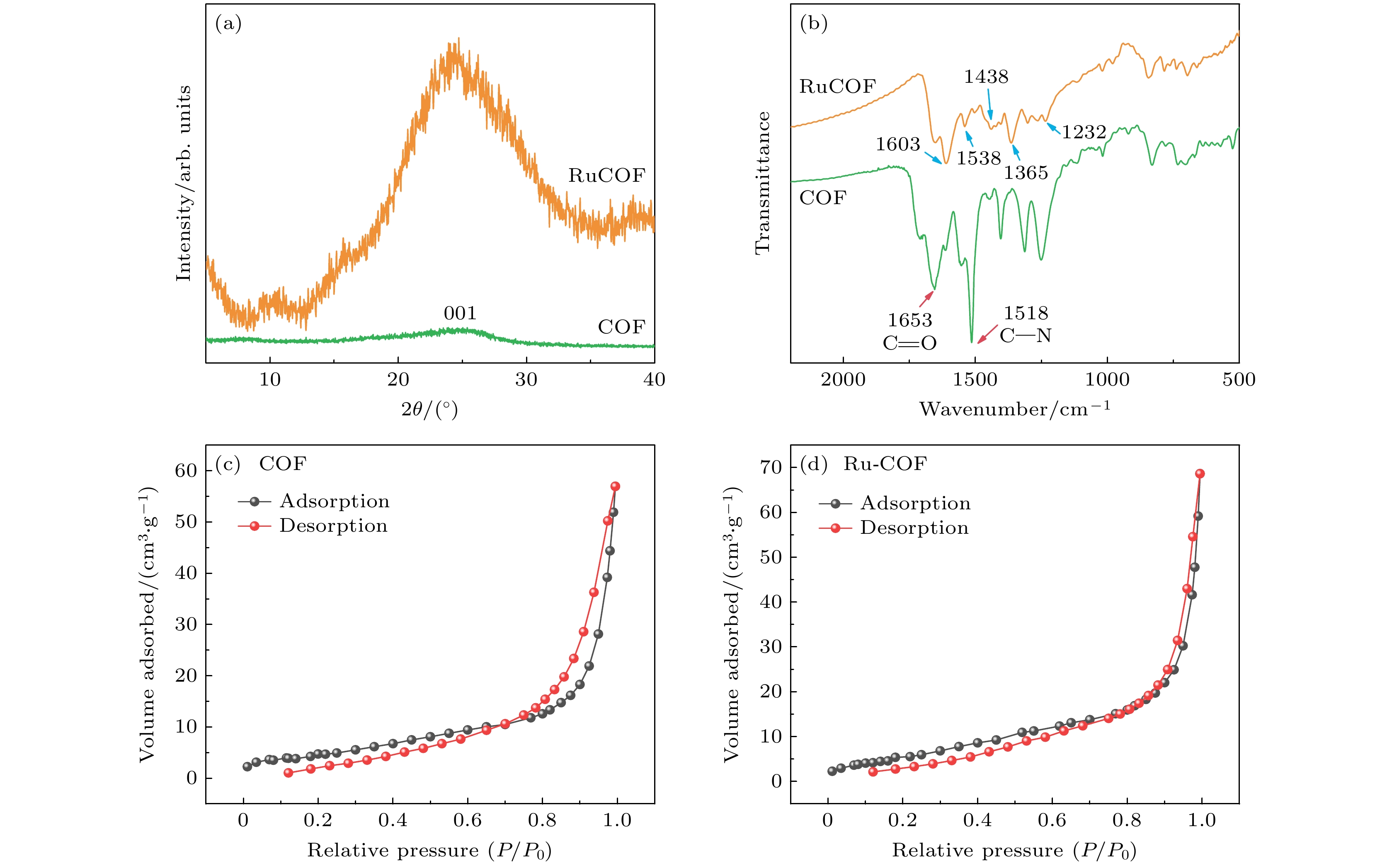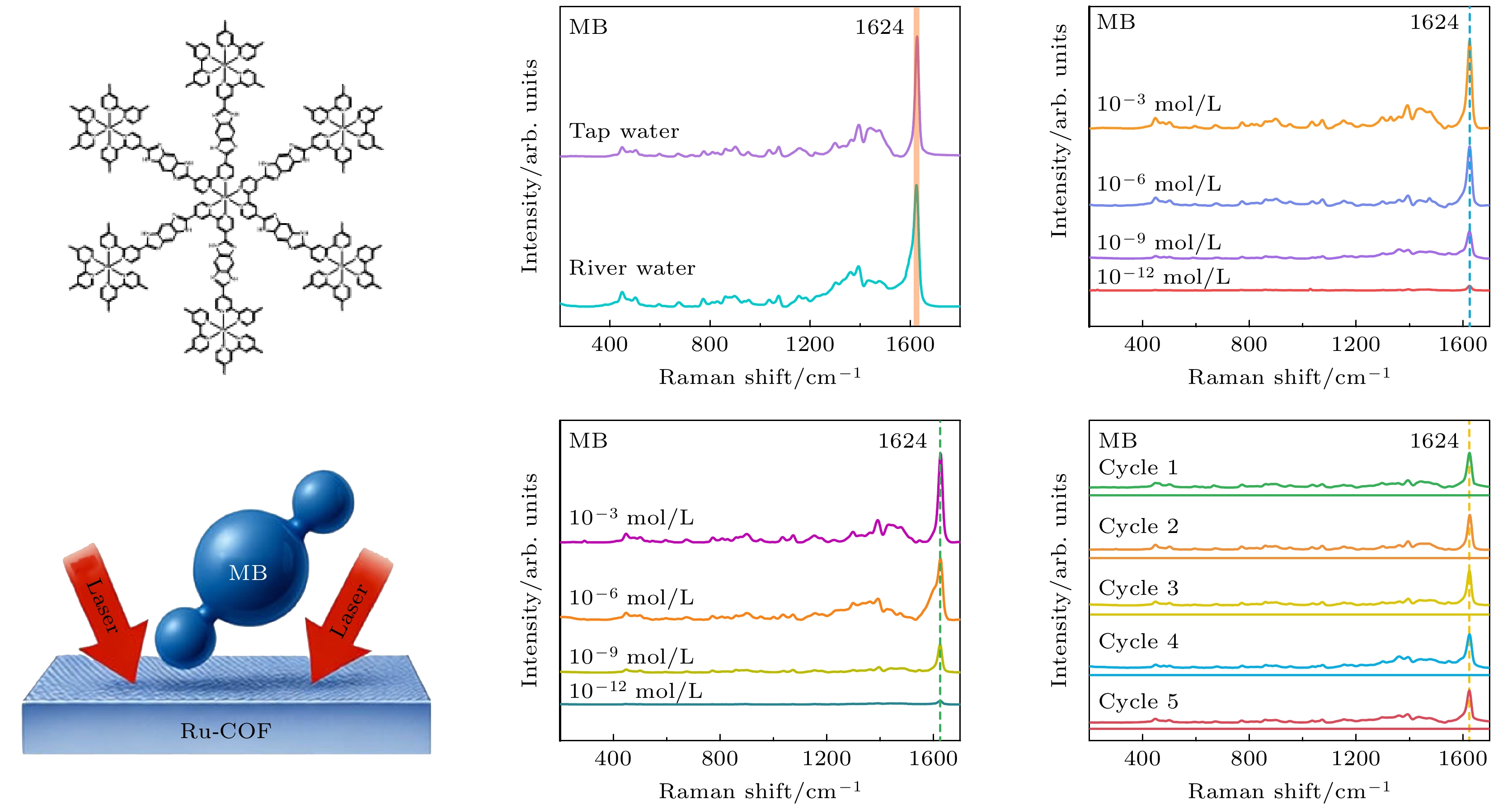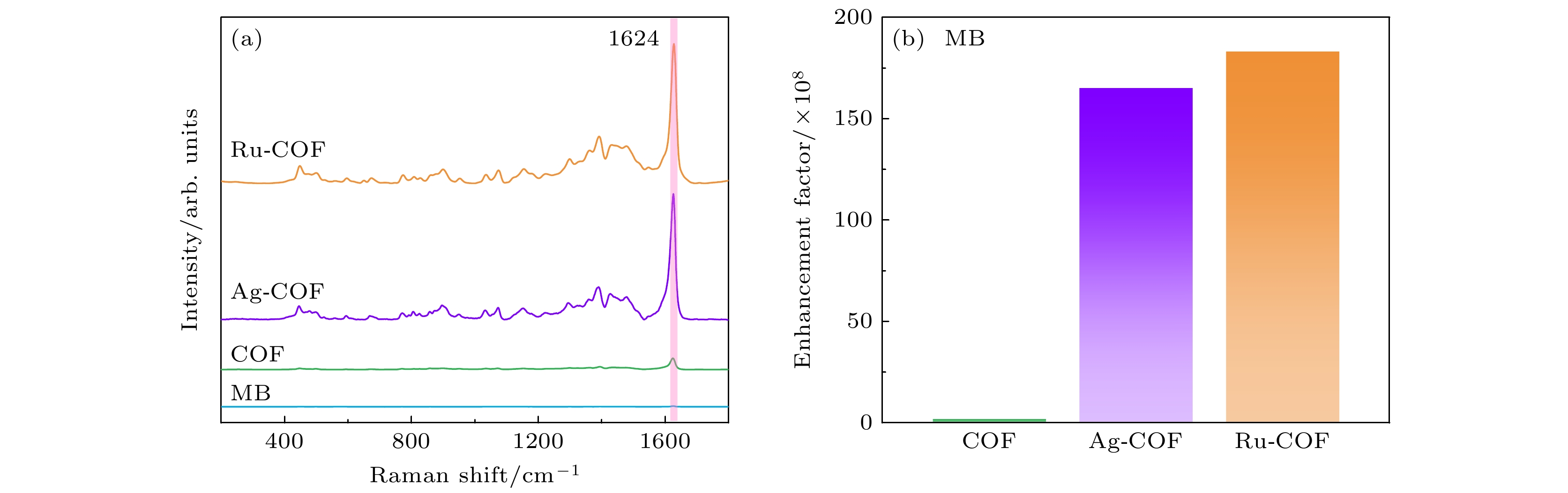 共价有机框架(covalent organic framework, COF)因具有高度有序的多孔结构、优异的分子吸附能力和结构稳定性, 被认为是一类具有潜力的表面增强拉曼散射(surface-enhanced Raman scattering, SERS)基底. 然而, 传统COF材料因缺乏等离激元特性而难以实现高强度的拉曼增强效应, 从而限制了其在高灵敏检测中的应用. 为此, 本研究设计并制备了一种新型钌基共价有机框架(Ru-COF)复合材料, 用于构建高性能SERS活性基底. 通过将钌配合物直接引入COF骨架, 形成稳定的Ru-N/O共价配位结构, 有效提高了钌的负载量和分散性, 显著增强了基底的电磁场耦合强度和电子传输能力. 与纯COF相比, Ru-COF基底在检测亚甲基蓝分子时表现出优异的SERS响应性能, 其检测限低至10–12 mol/L, 线性相关系数R2 ≥ 0.99, 增强因子高达1.83×1010, 信号重现性良好(相对标准偏差<5%), 并在空气中暴露4个月后仍保持超过90%的初始信号强度, 显示出极佳的稳定性与耐久性. 进一步的应用研究表明, Ru-COF基底在复杂水样中依然能够实现对痕量亚甲基蓝分子的稳定检测, 检测限仍维持在10–12 mol/L量级, 且具有优异的抗离子干扰与信号一致性. 这说明该基底不仅在标准条件下表现出卓越的灵敏度和重现性, 也具备在真实环境样品中进行高灵敏定量检测的潜力. 该材料的设计思路为金属-有机协同增强型SERS体系提供了新的研究方向, 并为其在环境污染物检测、食品安全分析及临床诊断等领域的实际应用奠定了重要基础.Covalent organic frameworks (COFs) have emerged as promising substrates for surface-enhanced Raman scattering (SERS) due to their highly ordered crystalline porous architecture, superior molecular adsorption and enrichment capabilities, and excellent thermal and chemical stability. However, pure COFs inherently lack plasmonic resonance and free electron density, resulting in limited electromagnetic enhancement and overall weak SERS signal, which hinders their practicality in ultrasensitive molecular detection applications. To overcome these limitations, this study aims to design and synthesize a novel ruthenium-based covalent organic framework composite (Ru-COF) by integrating ruthenium complexes directly into the COF skeleton, thereby creating a metal-organic, synergy-enhanced SERS substrate suited for trace analysis in real water.A Ru-COFis synthesized by solvothermal condensation of 1, 2, 4, 5-benzenetetramine (BTA·4HCl) with tris (4, 4’-dicarboxy-2, 2’-bipyridyl) ruthenium, forming Ru-N/O coordinated nodes within the framework. The material is characterizedusing X-ray diffraction (XRD) to confirm enhanced π-π stacking and new crystalline peaks at 10.2° and 16° in Ru-COF, Fourier-transform infrared spectroscopy (FT-IR) to verify amide and benzimidazole bond formations with shifts indicating Ru integration, Brunauer-Emmett-Teller (BET) analysis to reveal the increased specific surface areas (22.5 m2/g for Ru-COF vs. 17.2 m2/g for COF), and scanning electron microscopy (SEM) with energy-dispersive X-ray spectroscopy (EDS) mapping to show uniform distribution of C, N, O, and Ru elements in a dense layered morphology. SERS performance is evaluated using methylene blue (MB) as a probe molecule on a Renishaw InVia Raman spectrometer (514.5 nm excitation, 40 mW power, 10 s exposure), with additional tests on 4-mercaptobenzoic acid (4-MBA) for universality assessment. Enhancement mechanisms are analyzed through energy level alignments, with Ru-COF’s HOMO/LUMO at –0.95 eV/–1.12 eV (vs. vacuum) facilitating hole-injection charge transfer to MB’s levels (–2.34 eV/–4.15 eV), enhancing polarizability derivatives and Raman cross-sections via Herzberg-Teller coupling. The results demonstrate that Ru-COF exhibits superior SERS activity compared with pure COF and Ag-COF. For MB detection, the characteristic peak at 1624 cm–1 shows an analytical enhancement factor (EF) of 1.83 × 1010, calculated from normalized intensities and molecular densities, which far exceeds COF’s performance. Concentration-dependent spectra reveal a linear response from 10–3 to 10–13 M (R2 = 0.997), with a limit of detection (LOD, S/N = 3) of 4.16 × 10–12 M. Signal reproducibility is excellent, with a relative standard deviation (RSD) of 3.41% across 10 random spots. Cycling tests (5 repetitions) retain 90.2% of initial intensity, and long-term stability assessment shows 85.7% signal retention after four-months of air exposure. For 4-MBA, non-resonant enhancement yields an LOD of 10–12 mol/L, dominated by CM via interfacial coordination and π-π interactions. In complex matrices such as tap and river water, Ru-COF maintains LODs of 5.2 × 10–12 mol/L and 6.8 × 10–12 mol/L, respectively, with 91% signal retention after five cycles, demonstrating robust anti-interference against ions (e.g., Cl–, SO42–) and organic impurities, attributed to the hydrophobic porous structure and stable Ru coordination. In conclusion, the Ru-COF composite represents a breakthrough in SERS substrate design by achieving ultrasensitive detection through EM-CM synergy, with key physical outcomes including high EF, sub-picomolar LODs, and exceptional spatiotemporal stability. This work provides a novel paradigm for metal-embedded COFs in plasmonic sensing and lays the groundwork for practical applications in environmental monitoring, food safety, and biomedical diagnostics.