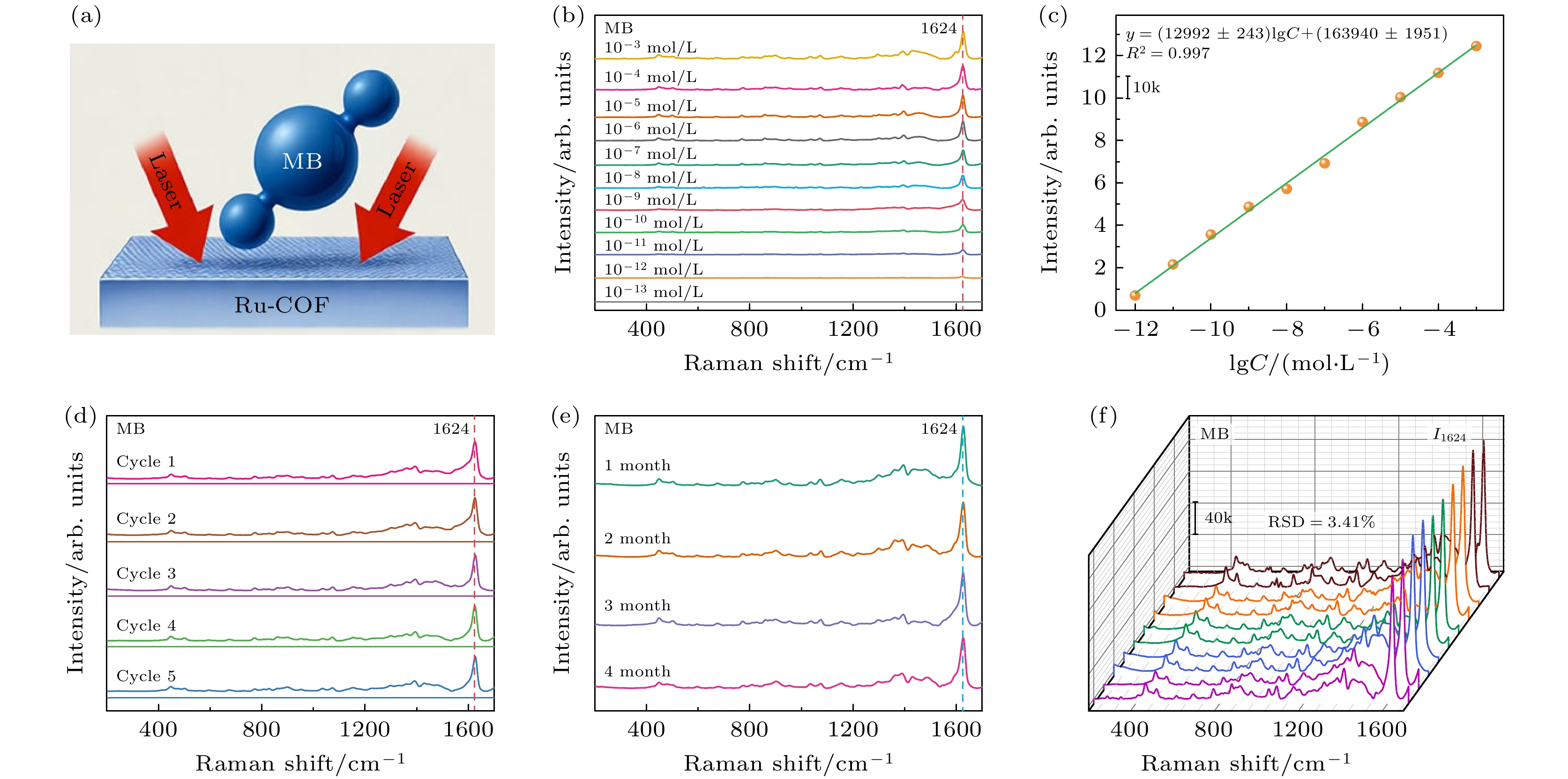图 5 (a) MB在Ru-COF基底上测试SERS光谱示意图; (b) 不同浓度的MB在Ru-COF基底上的SERS光谱; (c) 拉曼强度与不同MB浓度之间的线性关系; (d) Ru-COF在循环5次时的相应归一化拉曼强度; (e) Ru-COF样品在不同储存时间下的SERS强度; (f) Ru-COF在10个不同位置的MB SERS光谱