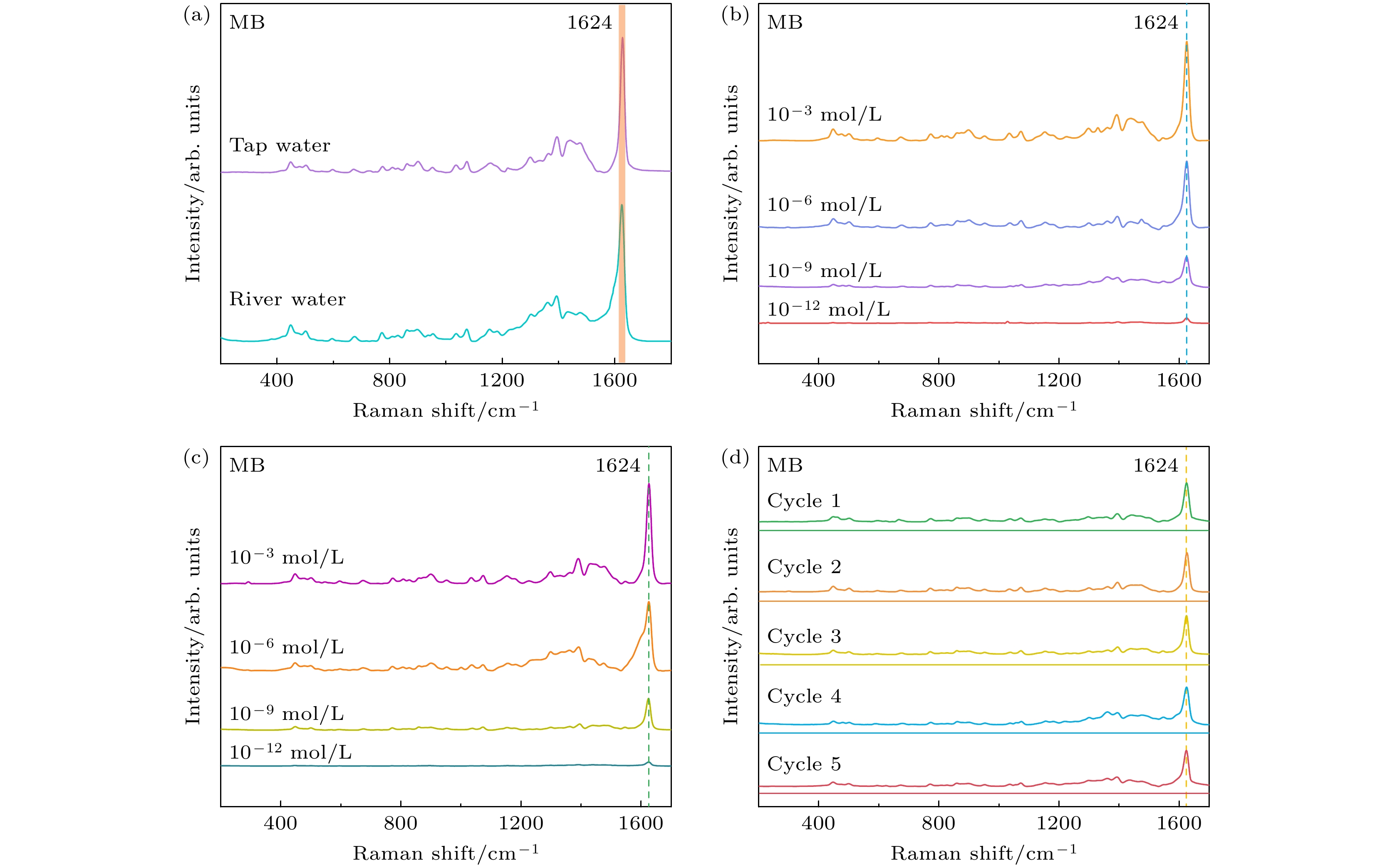 图 7 (a) Ru-COF基底在不同水样(自来水与河水)中检测MB的SERS光谱; (b) 不同浓度MB的自来水在Ru-COF基底上的SERS光谱; (c) 不同浓度MB的河水在Ru-COF基底上的SERS光谱; (d) Ru-COF在循环5次时的相应归一化拉曼强度