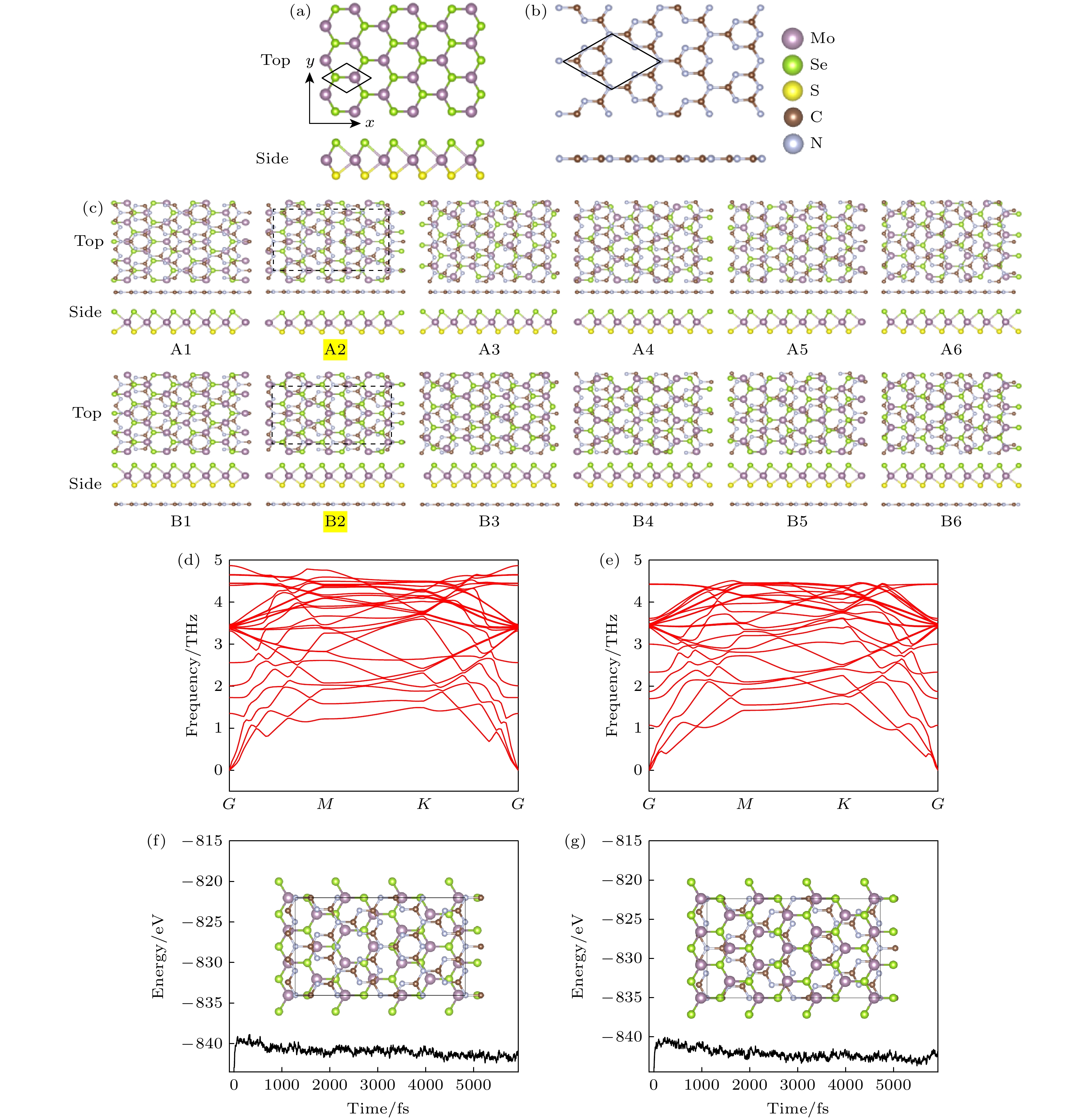 Fig. 1. (a) Top and side views of single-layer MoSSe and (b) g-C3N4. The black box indicates the unit-cell structure of MoSSe and g-C3N4; (c) top view and side view of different stacking configurations of SMoSe/g-C3N4 (A1–A6) and SeMoS/g-C3N4 (B1–B6). Among them, A2–A6 and B2–B6 are heterostructures obtained by rotating the MoSSe layers of A1 and B1 clockwise by 60° respectively (the smallest computational supercell is indicated by the black dashed box, and the shadows on A2 and B2 highlight the stacked configuration with the lowest binding energy); Phonon spectrum of (d) A2 and (e) B2 heterostructure; AIMD simulation results for (f) the A2 and (g) B2 heterostructure.