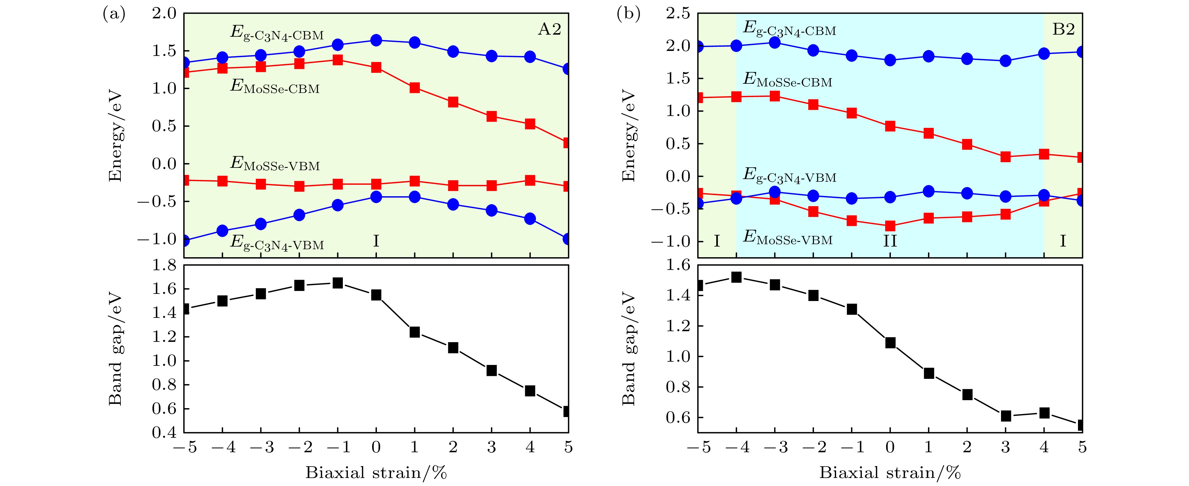 构建范德瓦耳斯异质结是丰富二维材料物性并增强其光电等性能的有效策略. 本文基于第一性原理模拟, 系统地研究了两种不同界面结构的Janus MoSSe/g-C3N4异质结(即SMoSe/g-C3N4和SeMoS/g-C3N4)的电子性质及其双轴应变调控规律. 结果表明, 针对SMoSe/g-C3N4异质结构, MoSSe本征偶极场与界面电场方向一致, 相互叠加形成由g-C3N4指向MoSSe的增强电场, 体系呈现I型能带排列特征; 而在SeMoS/g-C3N4异质结构中, 两者方向相反, 部分相互抵消后形成由MoSSe指向g-C3N4的净电场, 呈现II型能带排列特征, 可促进载流子的分离从而有效提升其光催化分解水活性. 进一步研究发现, 施加双轴应变可有效地调节两种异质结构的电子能带, 尤其在SeMoS/g-C3N4中可实现I型与II型能带结构的可逆转变. 本研究为Janus MoSSe/g-C3N4异质结在光催化与光电器件领域的应用提供了理论依据.Constructing van der Waals (vdW) heterostructures has emerged as an effective strategy for enriching the physical properties of two-dimensional materials and optimizing their optoelectronic performance. In this work, we systematically investigate the electronic properties and biaxial strain modulation of Janus MoSSe/g-C3N4 heterostructures with two distinct interfacial configurations—SMoSe/g-C3N4 and SeMoS/g-C3N4—by means of first-principles simulations. Binding energy comparisons and AIMD simulations are performed to determine the most stable stacking pattern of each type of the heterostructure. The analyses of the electrostatic potential and work function reveal that the intrinsic dipole of MoSSe layer and the interfacial electric field in the SMoSe/g-C3N4 heterostructure undergo a constructive superposition. This enhances the overall built-in electric field, which points from g-C3N4 layer to MoSSe layer, resulting in a type-I band alignment. In contrast, in the SeMoS/g-C3N4 configuration, the two fields oppose each other, leading to a net electric field directed from MoSSe to g-C3N4 layer. This leads to a type-II band alignment, which facilitates spatial carrier separation and significantly enhances photocatalytic water-splitting activity. Furthermore, this study also demonstrates that biaxial strain can effectively modulate the electronic band structures of both types of heterostructures. In particular, the SeMoS/g-C3N4 system exhibits a reversible transition between type-I and type-II band alignments under specific compressive (–4%) and tensile (+5%) strain states. The underlying mechanism is elucidated by the difference charge density calculations. This study provides theoretical insights into the role of interfacial and intrinsic dipoles combined with strain engineering, offering a viable route for designing efficient MoSSe/g-C3N4-based photocatalysts and optoelectronic devices.