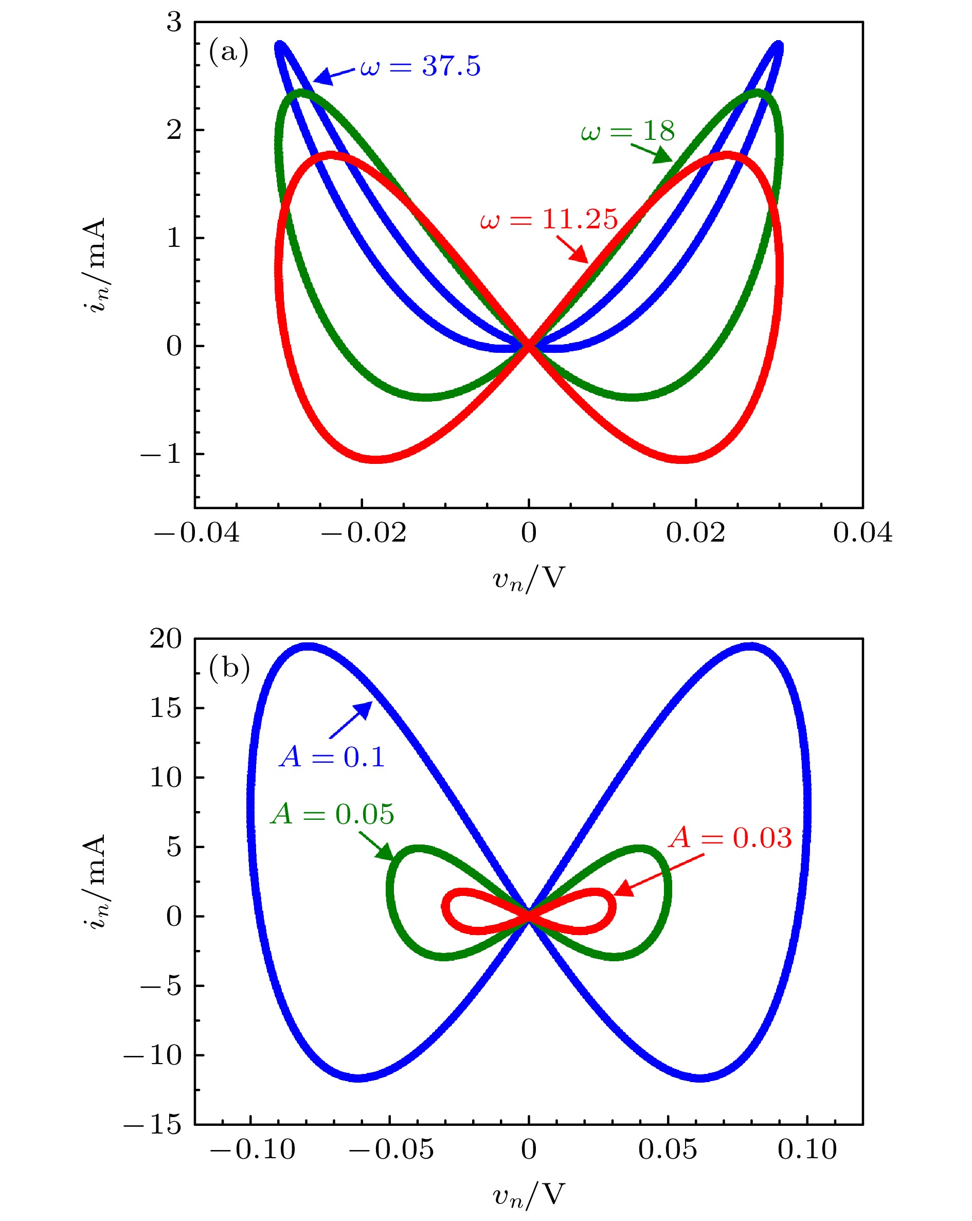 图 1 施加$ v_n=A\sin (\omega n) $时忆阻器的磁滞回线 (a)固定A = 0.03, ω分别取11.25, 18, 37.5; (b) 固定ω = 11.25, A分别取0.03, 0.05, 0.1