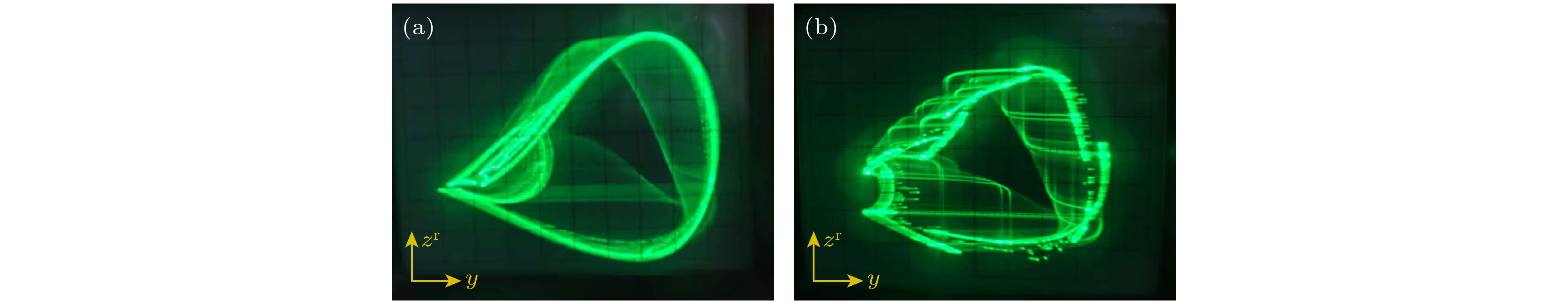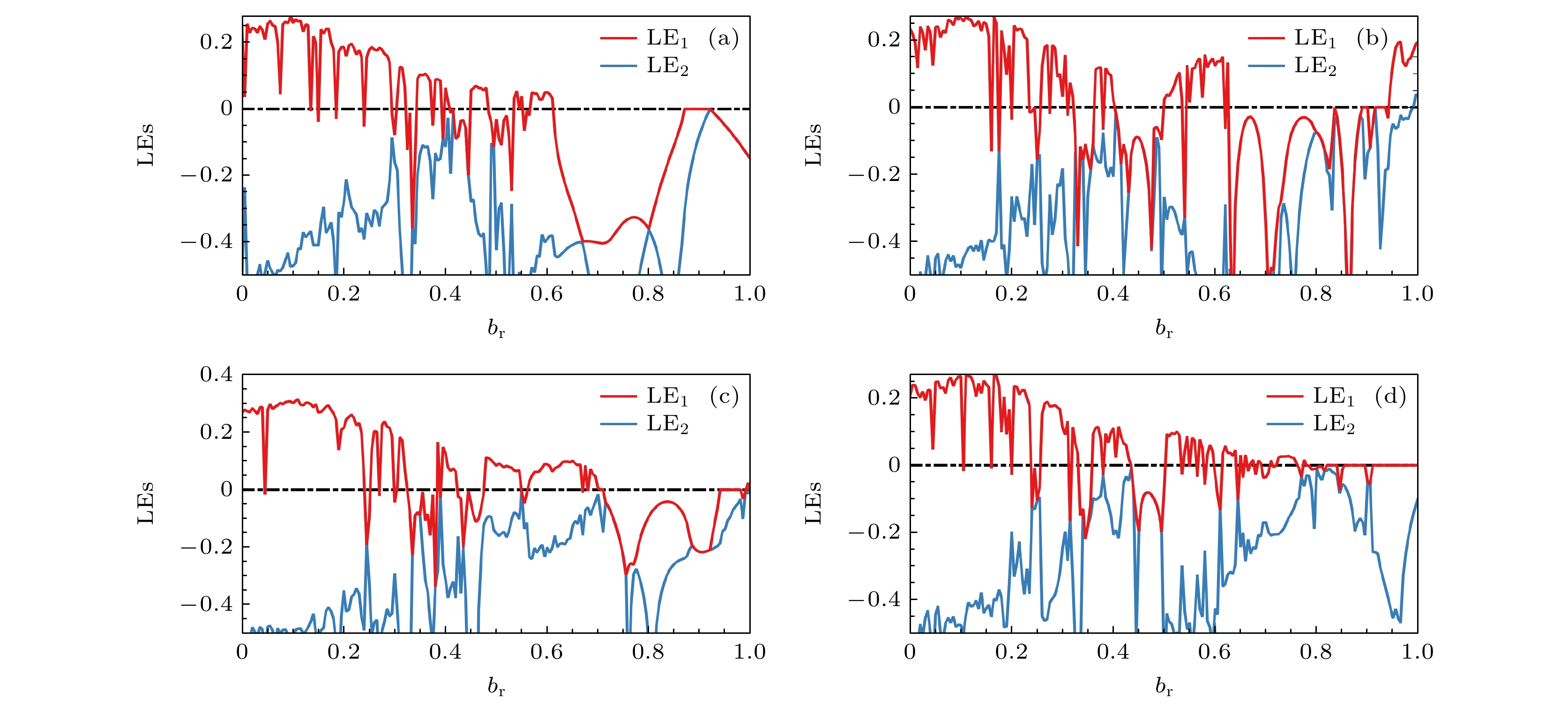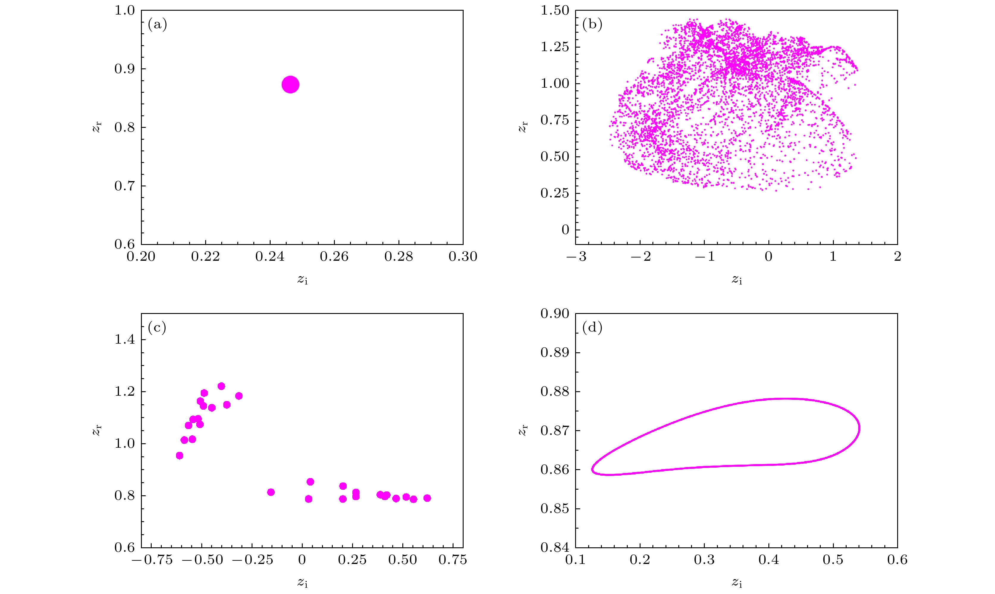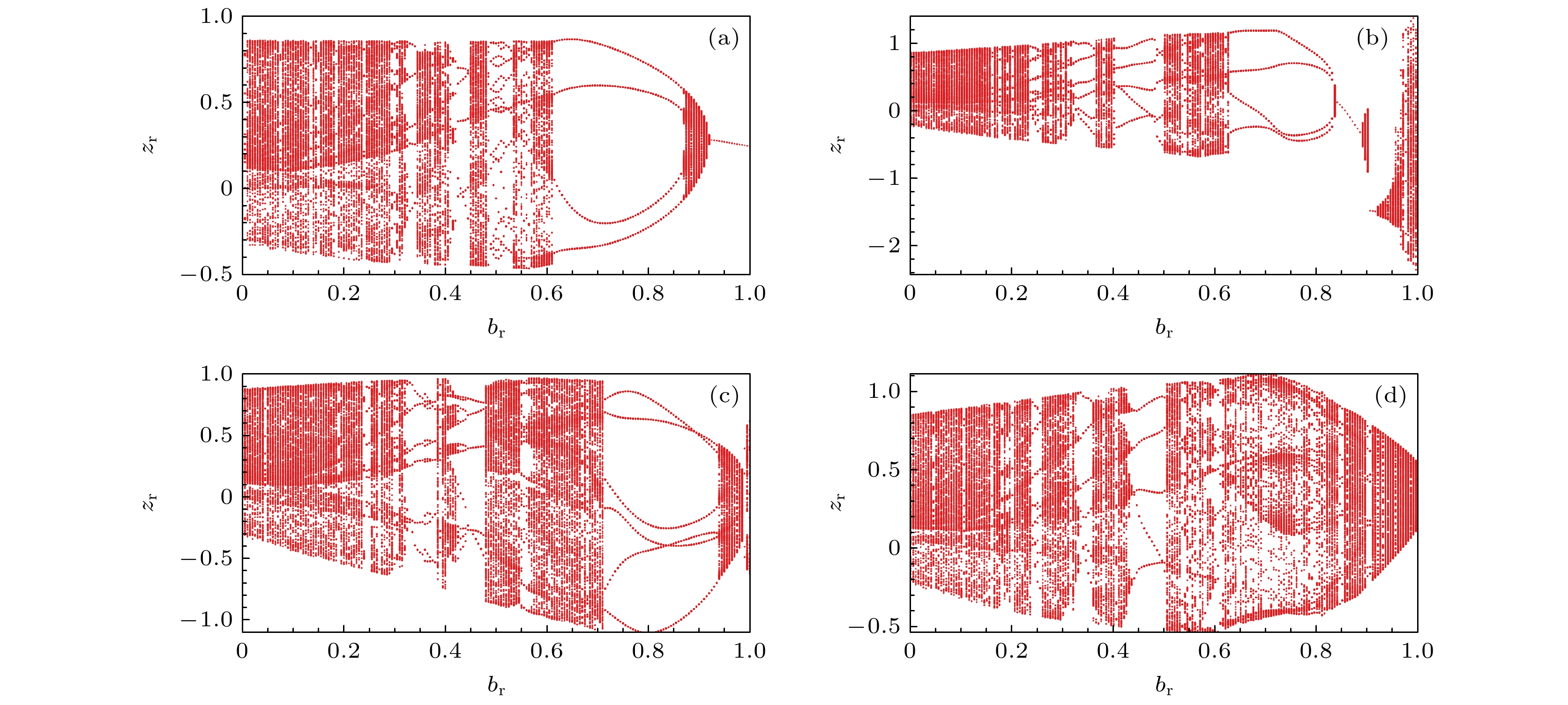 图 5 在$ y{\text{-}}z_{\mathrm{r}} $(红色)和$ y{\text{-}}z_{\mathrm{i}} $(蓝色)平面上的相图 (a) 混沌吸引子, $ b_{\mathrm{r}} $ = 0.1; (b) 周期吸引子, $ b_{\mathrm{r}} $ = 0.3; (c) 混沌吸引子, $ b_{\mathrm{r}} $ = 0.4; (d) 准周期吸引子, $ b_{\mathrm{r}} $ = 0.9