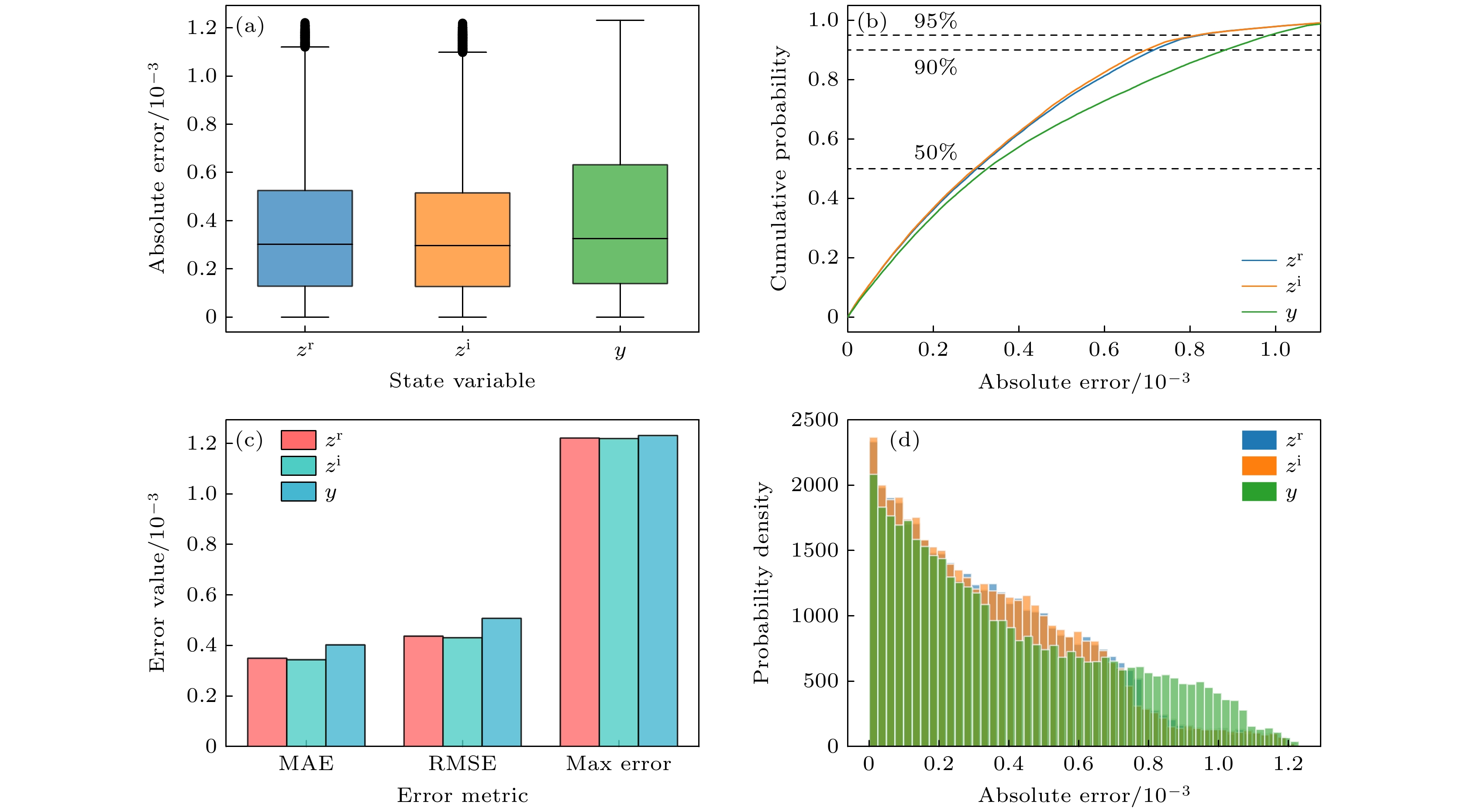 图 11 基于FPGA产生混沌序列与数值仿真之间的误差统计 (a)绝对误差分布; (b)绝对误差累积分布函数; (c)误差指标对比; (d)绝对误差分布直方图