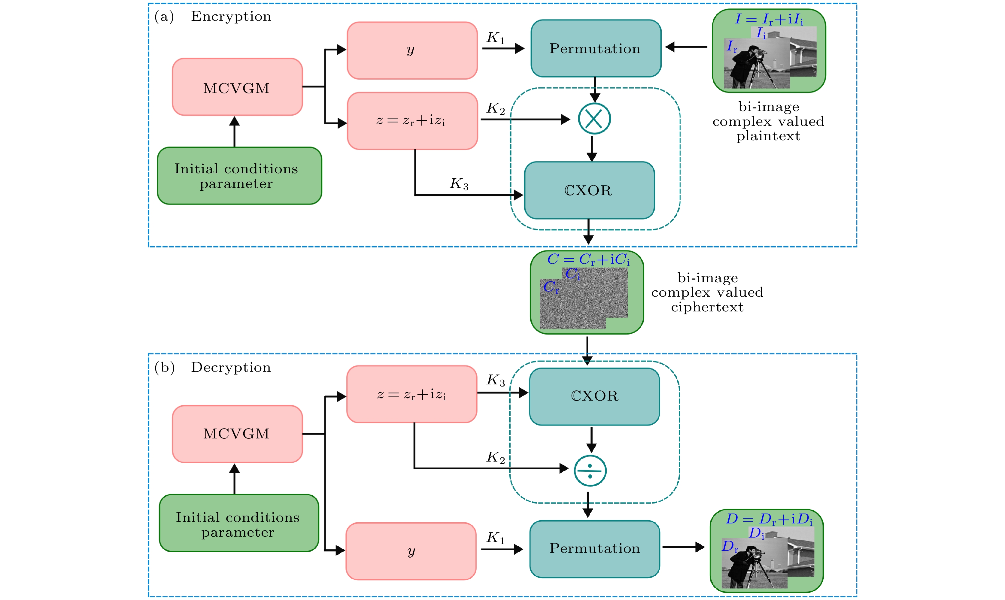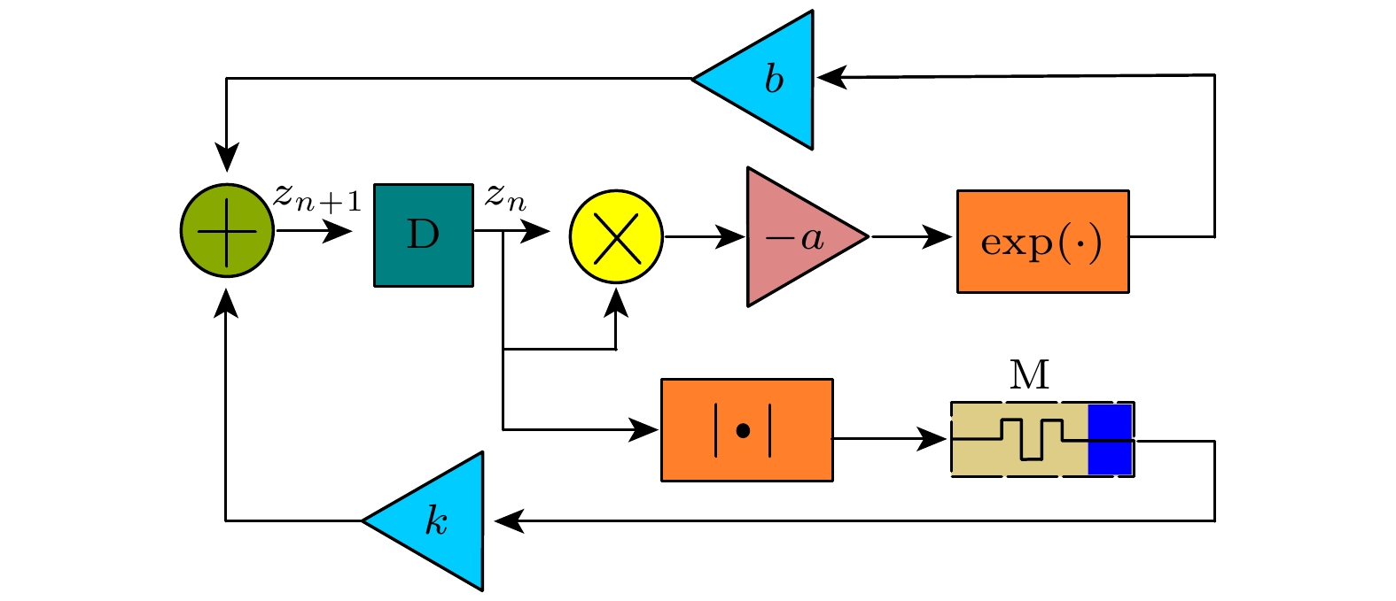 设计新型混沌系统能够丰富加密系统的候选资源, 是基于混沌加密安全性的重要途径. 离散忆阻器因其固有的非线性特性与电路友好特性, 为构建新型混沌系统提供了有效途径. 然而, 其在复值离散混沌系统中的应用仍有待探索. 为此, 本文构建了一种基于离散忆阻器的复高斯混沌模型, 其中忆阻器由复数模长驱动. 通过李雅普诺夫指数、分岔图和相图等数值仿真分析, 验证了该系统具有增强的混沌特性. 同时, 在FPGA数字平台上实现了该模型的硬件部署, 证明其硬件可行性. 基于该模型生成的复值混沌序列, 本文进一步设计了一种双图像加密方案, 将两幅图像视为复数矩阵的实部和虚部, 通过混沌序列进行置乱和扩散操作. 仿真结果表明, 该加密方案具有高安全性, 能够抵抗多种攻击.The exploration of complex-valued chaos not only provides a feasible approach for practical applications such as image encryption, but also has great potential in simulating wave phenomena and quantum inspired process. In order to bridge it with nonlinear circuit components, we introduce a novel complex-valued chaotic system by embedding a discrete memristor into a complex Gaussian map. The memristor, a component with inherent physical memory, is uniquely driven by the modulus of the complex state variable, which is a key physical quantity often related to energy or amplitude in wave systems. This coupling induces complex nonlinear dynamics, which are physically characterized through Lyapunov exponents and bifurcation analysis, revealing an enhanced and more robust chaotic regime. The physical feasibility of this system is demonstrated by its successful hardware realization on an FPGA platform. To demonstrate its potential applications, we leverage the complex chaotic flows of the system to engineer a dual-image encryption scheme, where the encryption process is explained as a physical diffusion and scrambling of information represented by a complex matrix. Our results verify that this approach not only yields a cryptosystem with high security but also provides a link between complex chaos and information security applications.