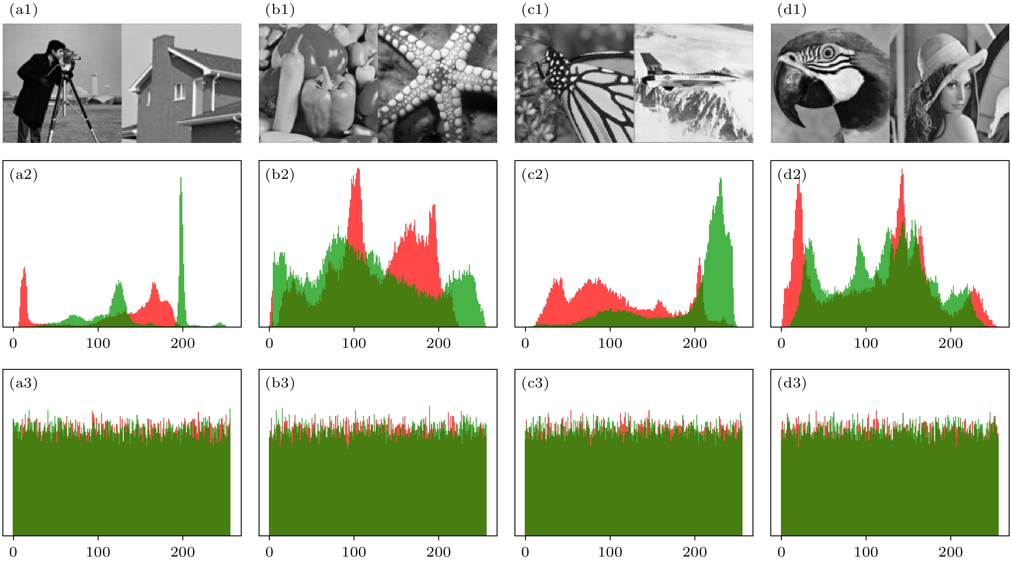 图像 原始图像 密文图像 H V D H V D I1 Cameraman 0.9576 0.9259 0.9147 0.0015 0.0027 –0.0034 House 0.9669 0.9460 0.9779 0.0012 –0.0021 0.0011 I2 Pepper 0.9439 0.9585 0.9106 –0.0092 0.0071 –0.0099 Starfish 0.9630 0.9357 0.8983 –0.0016 0.0037 –0.0055 I3 Butterfly 0.9310 0.9388 0.9017 0.0080 –0.0011 0.0008 Aircraft 0.9037 0.9122 0.8427 0.0023 –0.0088 0.0014 I4 Parrot 0.9406 0.9532 0.9199 0.0037 0.0093 –0.0074 Lena 0.9716 0.9437 0.9240 0.0019 –0.0010 0.0092 表 2 原始图像和加密图像的信息熵