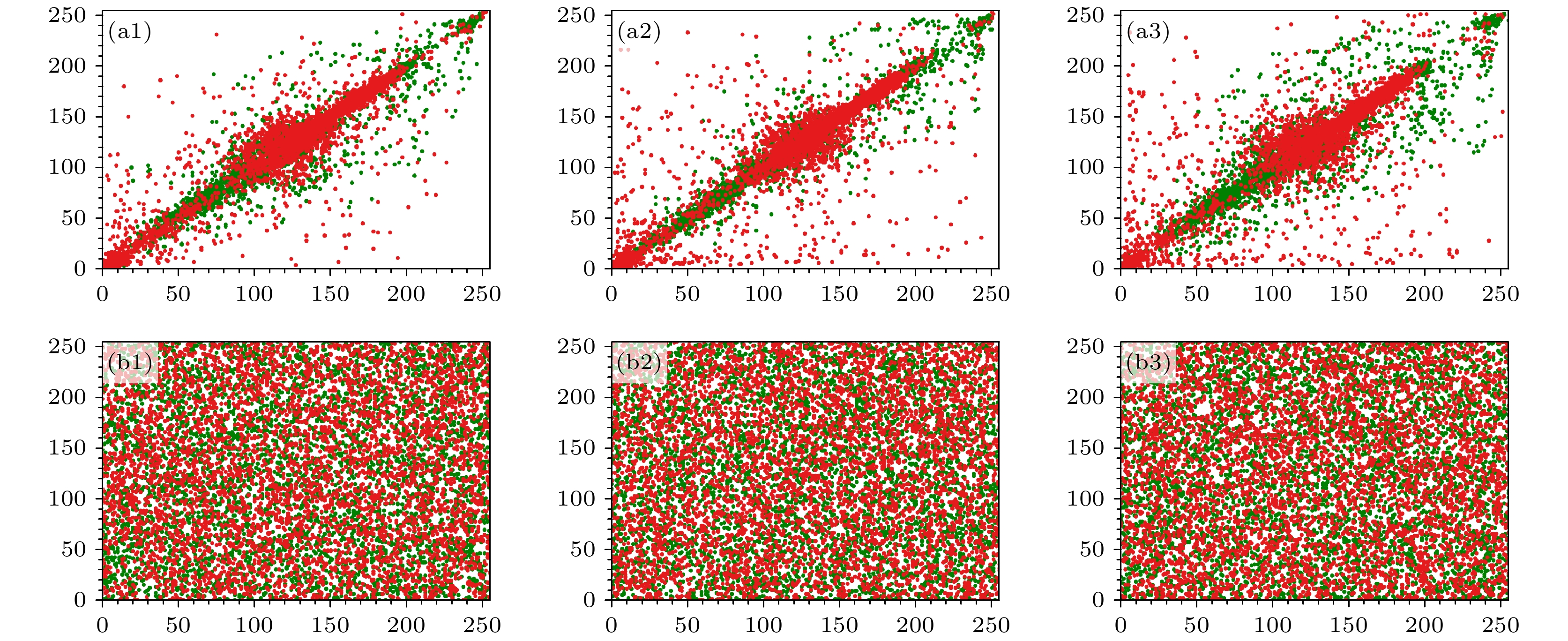 图 15 图像的像素相关性分布 (a1)水平方向, (a2)垂直方向, (a3)对角方向的原始图像; (b1)水平方向, (b2)垂直方向, (b3)对角方向的加密图像