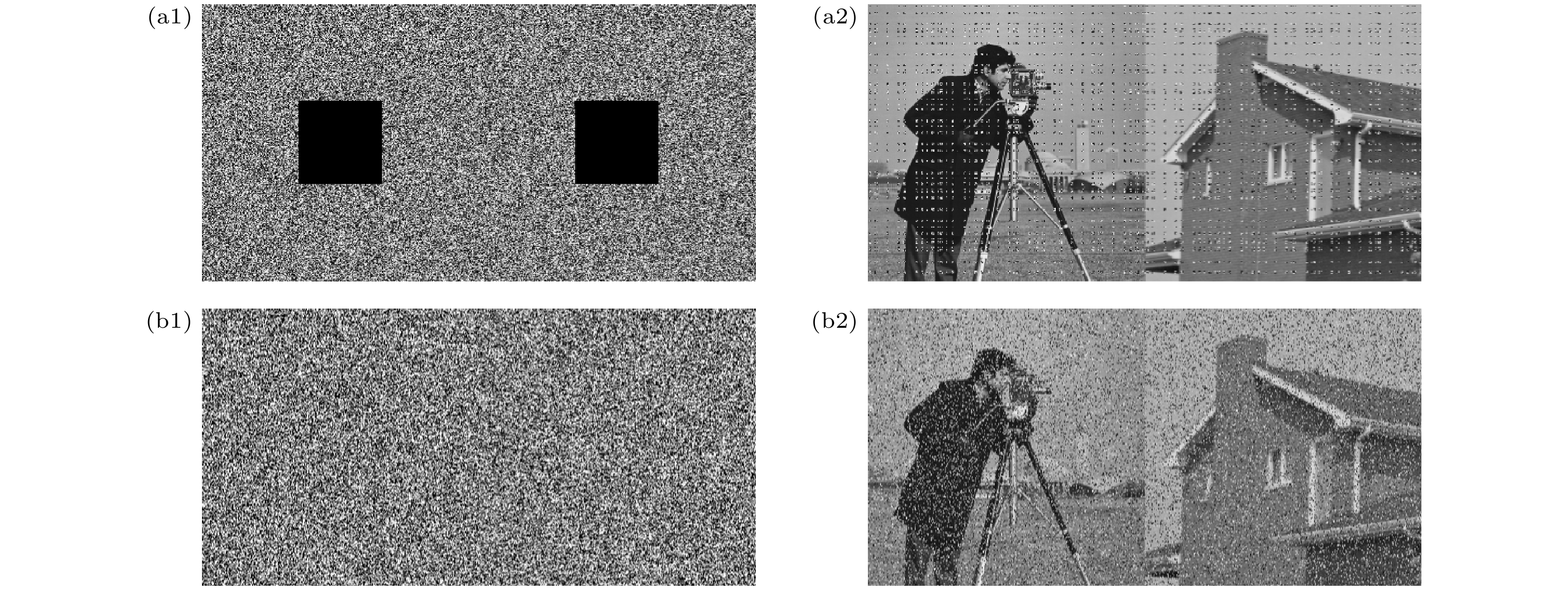 图 16 数据丢失与噪声攻击测试结果 (a1) 图像I1密文遭受30%数据丢失后的图像; (a2) 从数据丢失后的密文恢复出的图像; (b1) 图像I1密文添加强度为30%的椒盐噪声后的图像; (b2) 从被添加噪声后的密文中恢复的图像