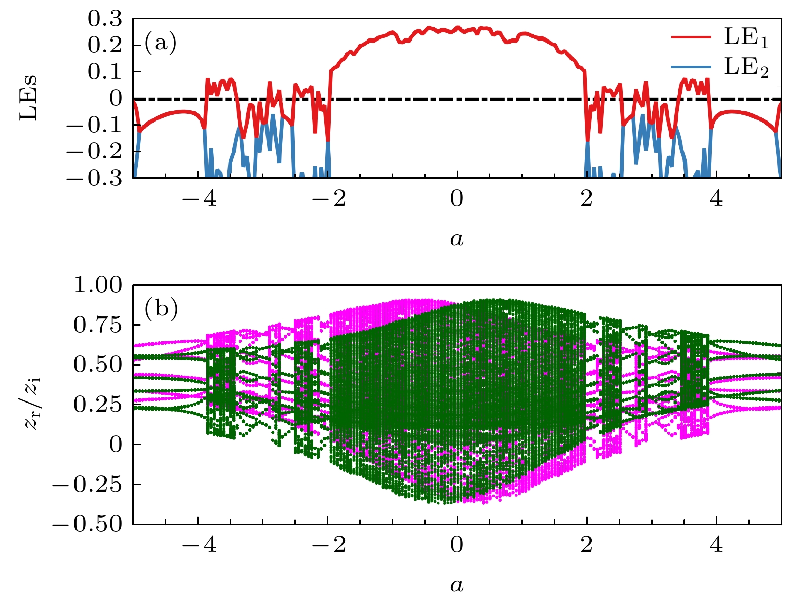 Fig. 4. The coupling parameter b-dependent dynamical behavior simulations: (a1), (a2) $ b_{\mathrm{r}}\in[0, 1] $ with $ b_{\mathrm{i}}=0.1 $; (b1), (b2) $ b_{\mathrm{i}}\in[-0.8, 0.8] $ with $ b_{\mathrm{r}}=0.1 $